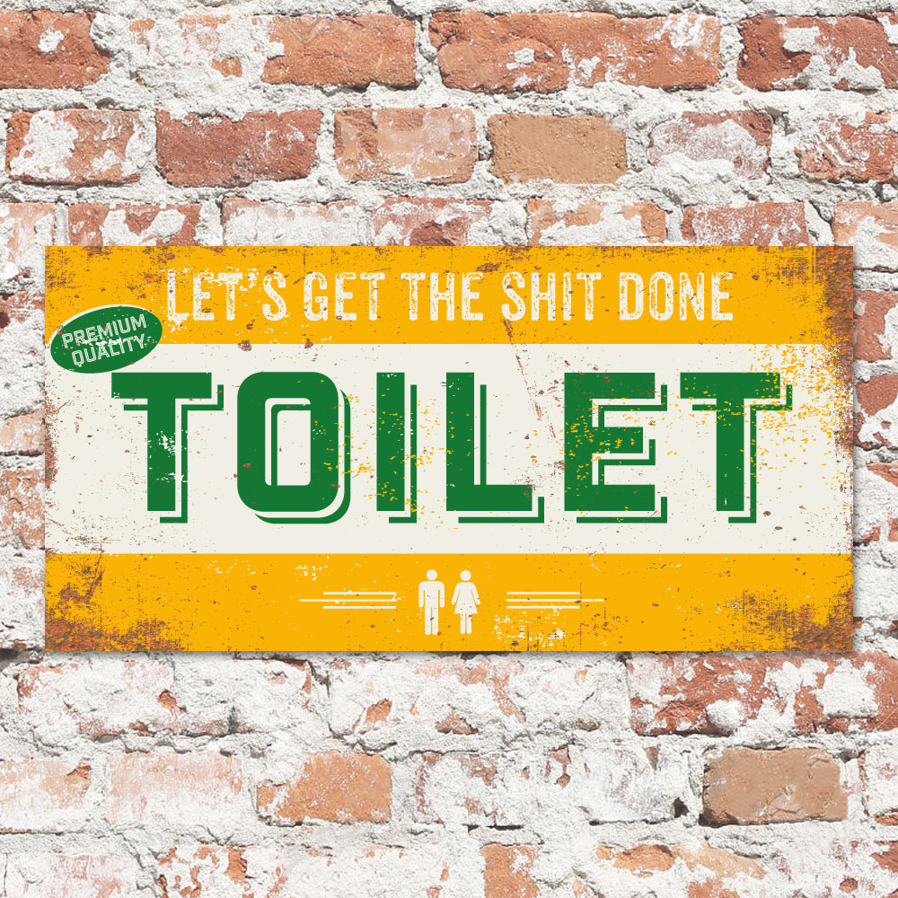Mooie geel, groen en wit “vintage” bord (Engelstalig reclamebord) voor op de toiletdeur. Het bord wordt geplakt op dibond (2 lagen aluminium met zwarte kern). Dit bord wordt geleverd met plakgum zodat je het eenvoudig aan de deur kun bevestigen. Erg origineel en stoer op deur van het toilet.