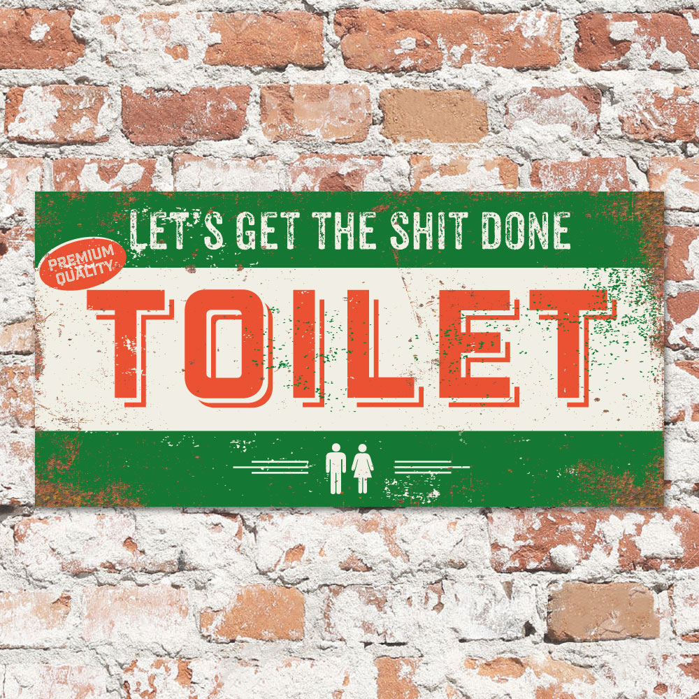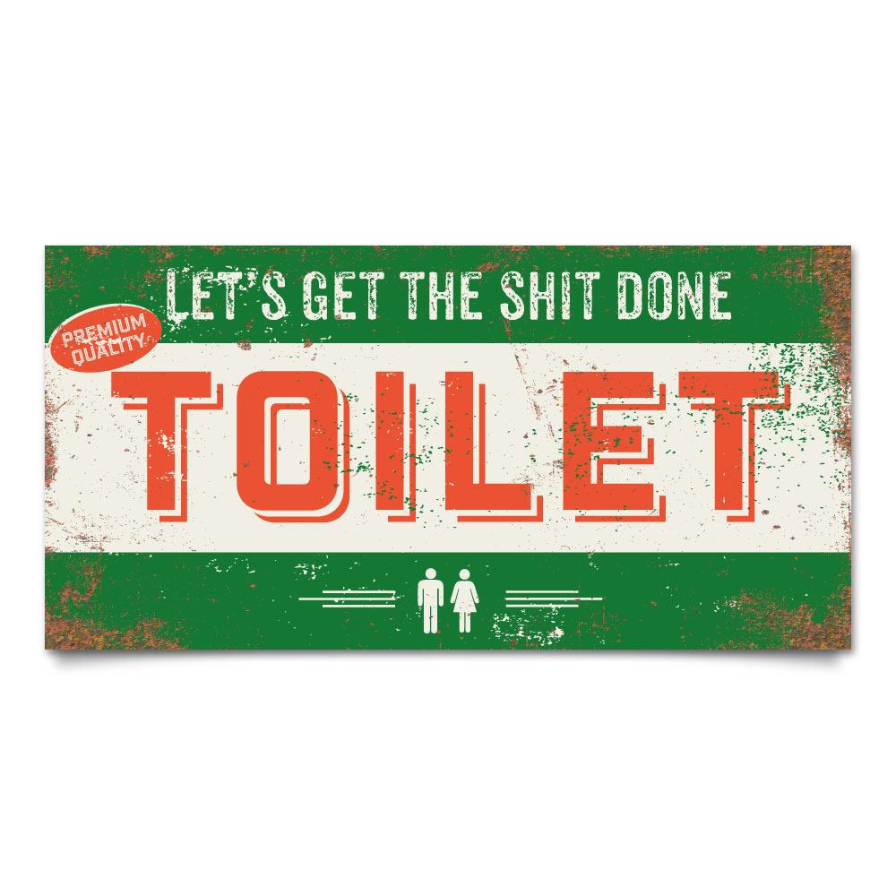 Mooie geel, groen en wit “vintage” bord (Engelstalig reclamebord) voor op de toiletdeur. Het bord wordt geplakt op dibond (2 lagen aluminium met zwarte kern). Dit bord wordt geleverd met plakgum zodat je het eenvoudig aan de deur kun bevestigen. Erg origineel en stoer op deur van het toilet.