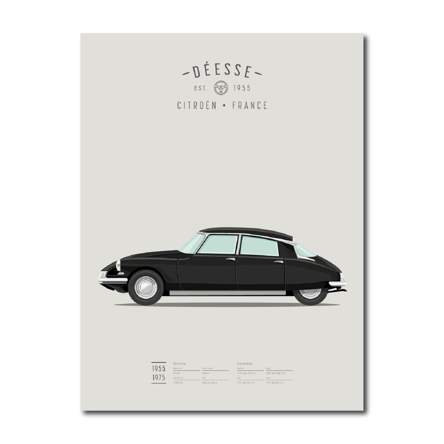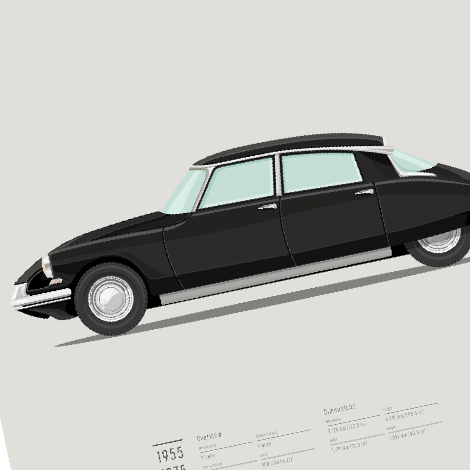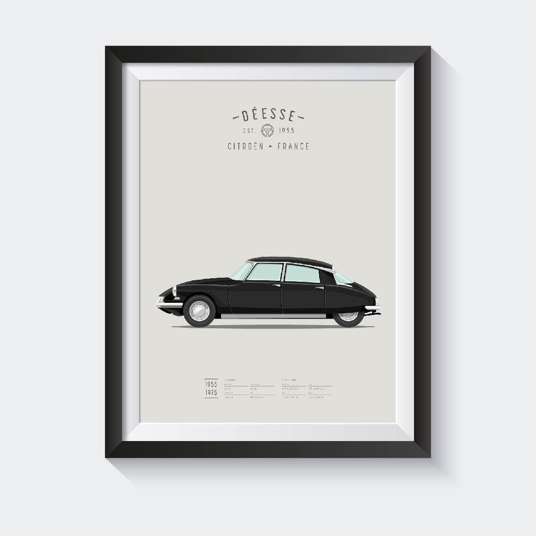 Mooie illustratie van een blauwe Citroen DS, gemaakt door Koenmeloen. Leuk voor de liefhebber, als decoratie in bijvoorbeeld je woonkamer en werkkamer.
