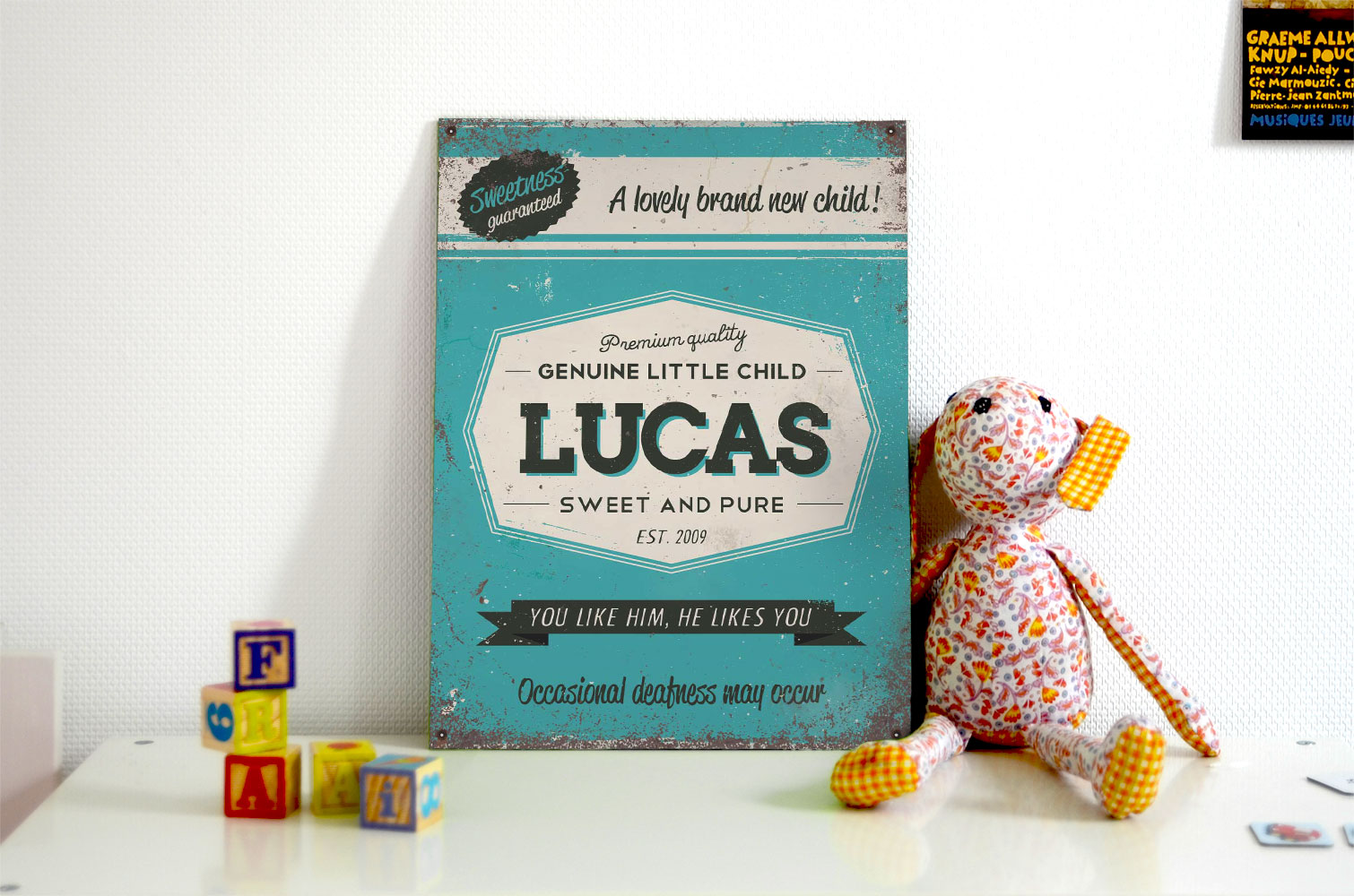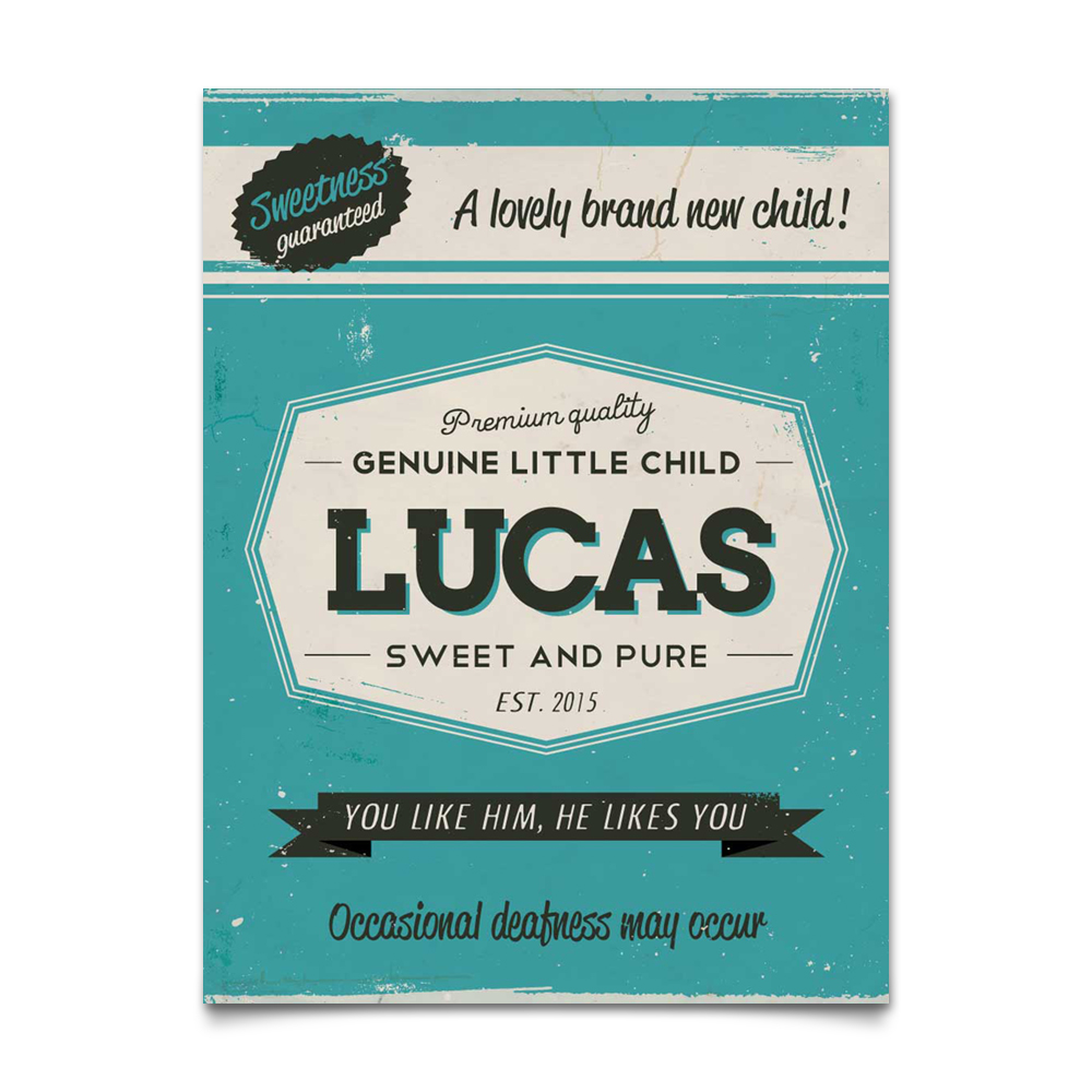 Mooie blauwe “vintage” geboortebord (Engelstalig reclamebord) met de naam en geboortedatum van uw kind. Het geboortebord wordt geplakt op dibond (2 lagen aluminium met zwarte kern). Alle formaten worden met een handig ophanghaakje geleverd.