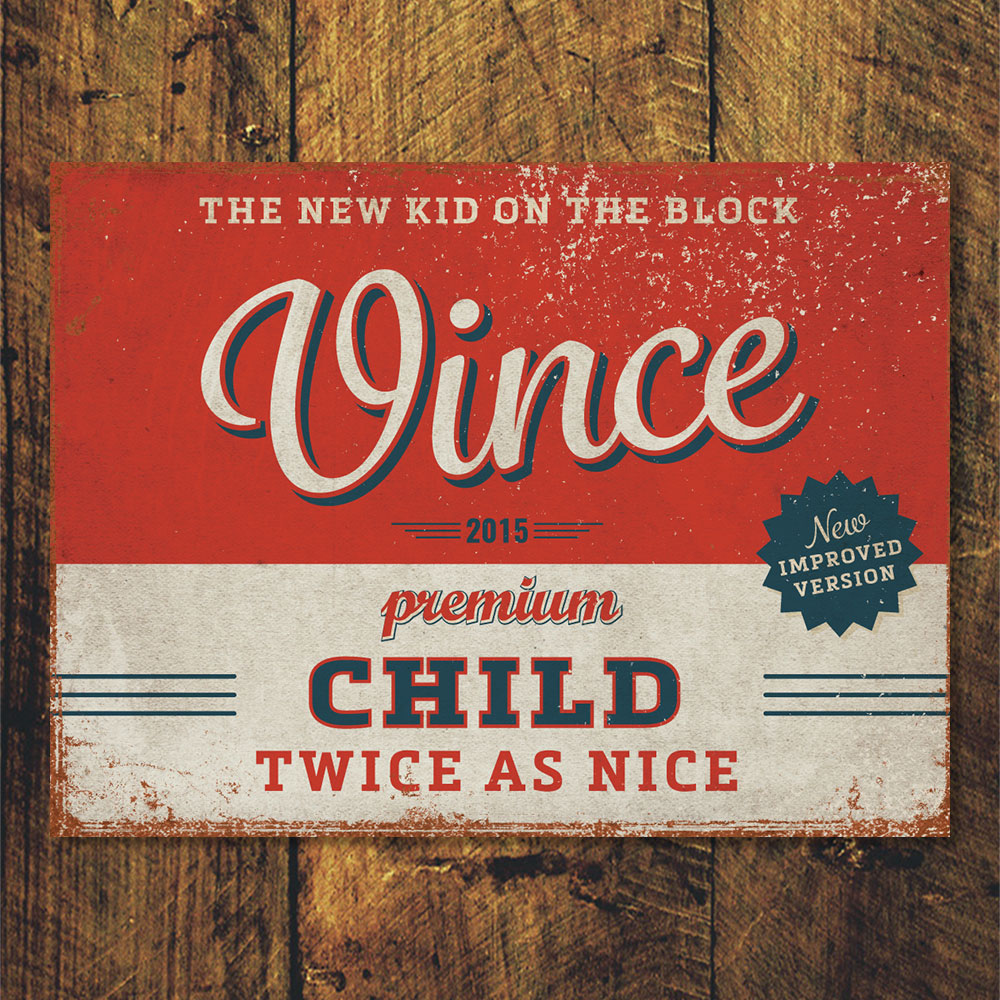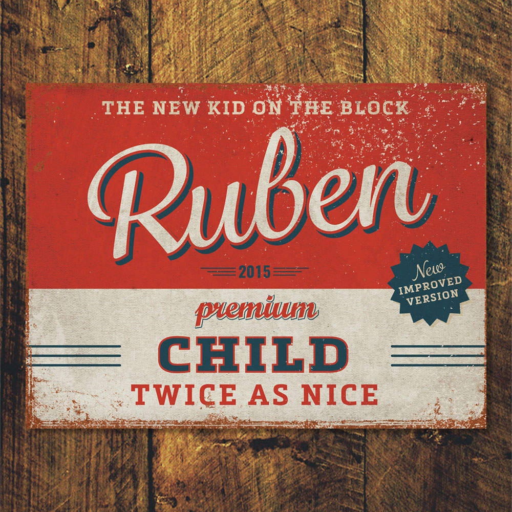 Mooie rood met blauw “vintage” poster (Engelstalig reclamebord) met de naam en geboortedatum van uw kind. De print wordt geplakt op zwart dibond (aluminium met zwarte kern). Alle formaten worden met een handig ophanghaakje geleverd. Het liggende formaat staat ook erg mooi op deur van de kinderkamer.