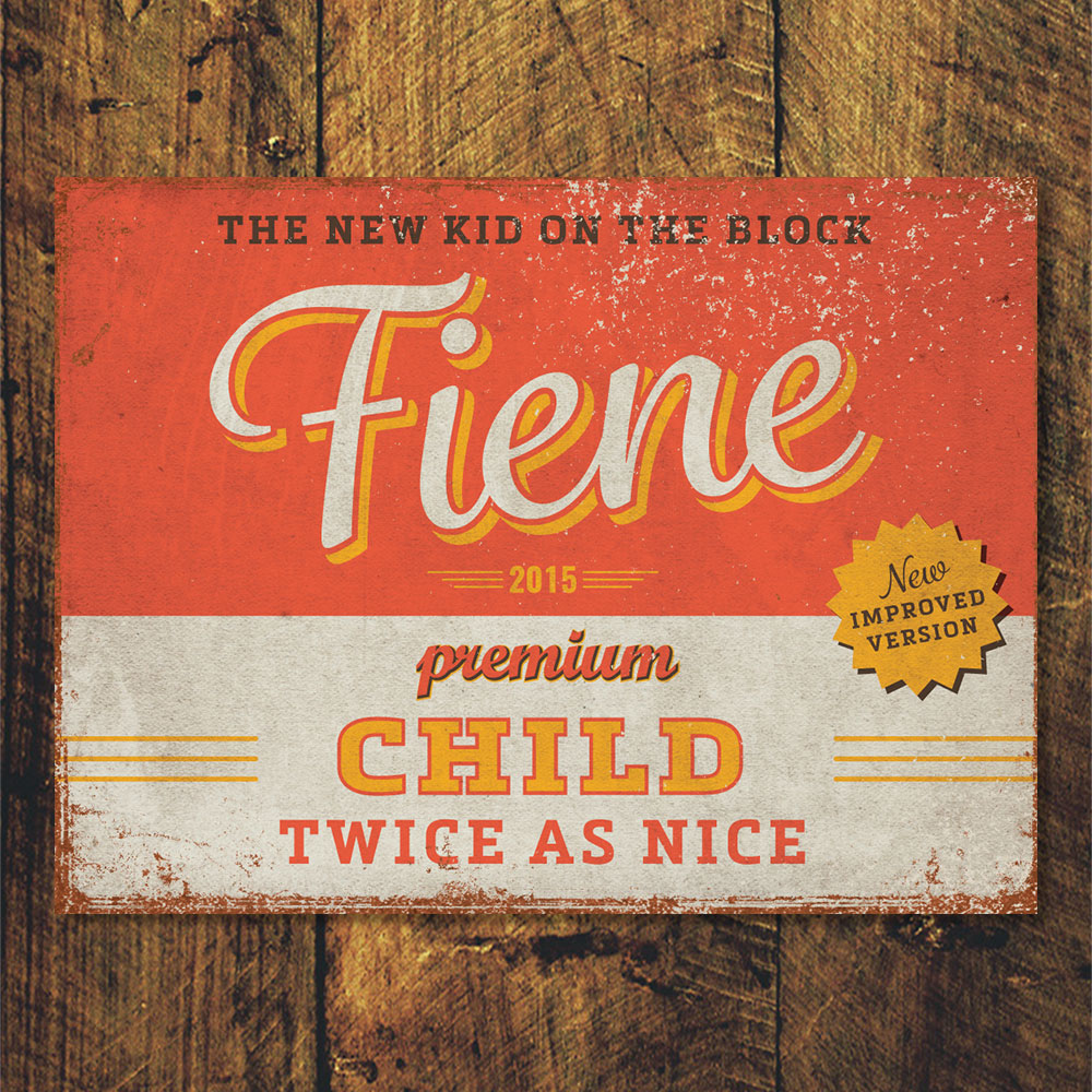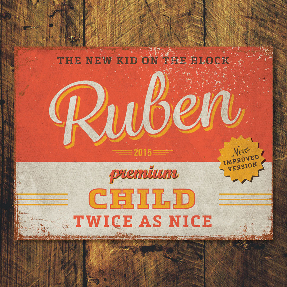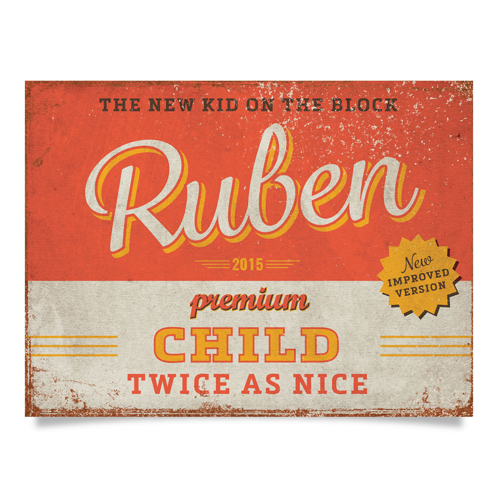 Mooie rood met geel “vintage” poster (Engelstalig reclamebord) met de naam en geboortedatum van uw kind. De print wordt geplakt op zwart dibond (aluminium met zwarte kern). Alle formaten worden met een handig ophanghaakje geleverd. Het liggende formaat staat ook erg mooi op deur van de kinderkamer.