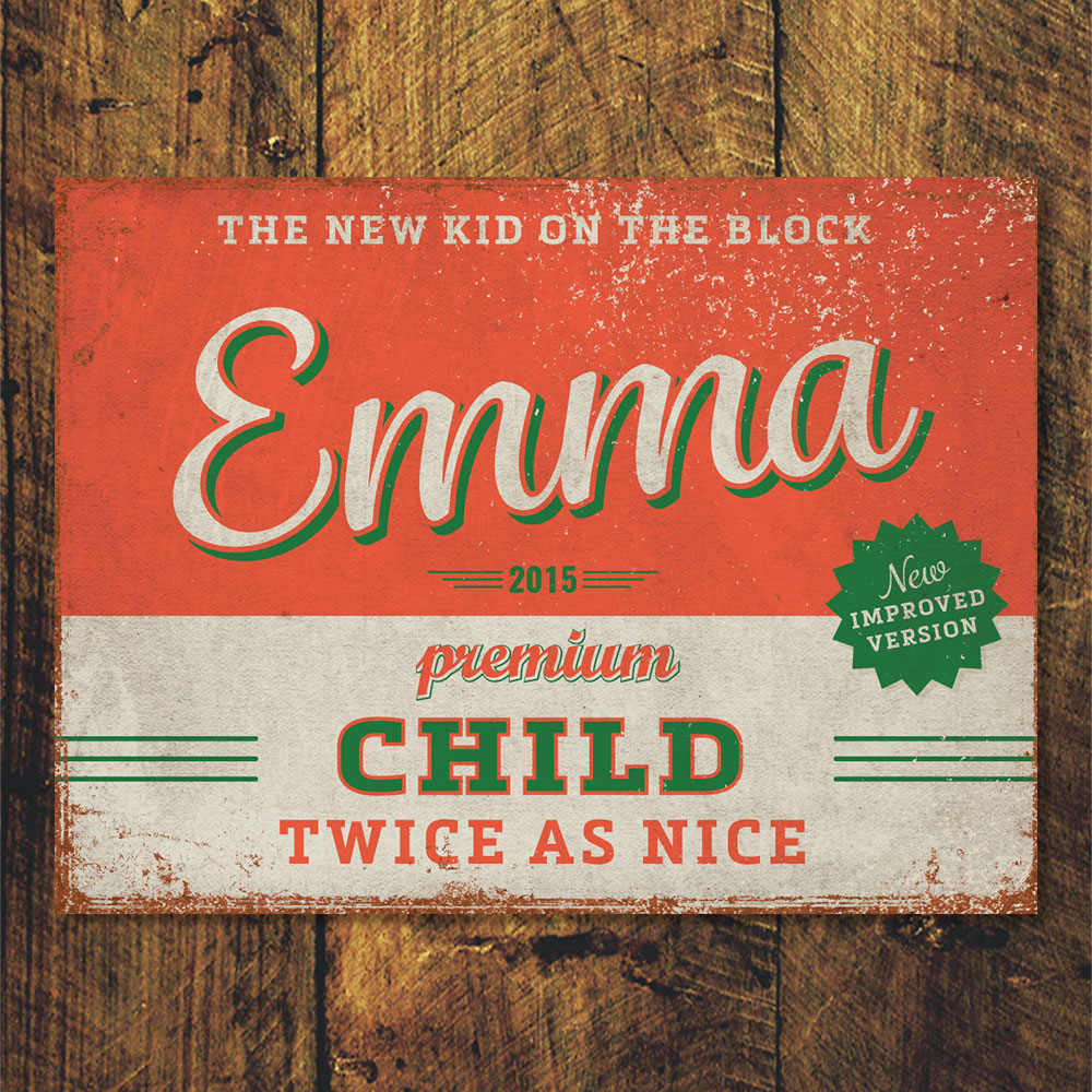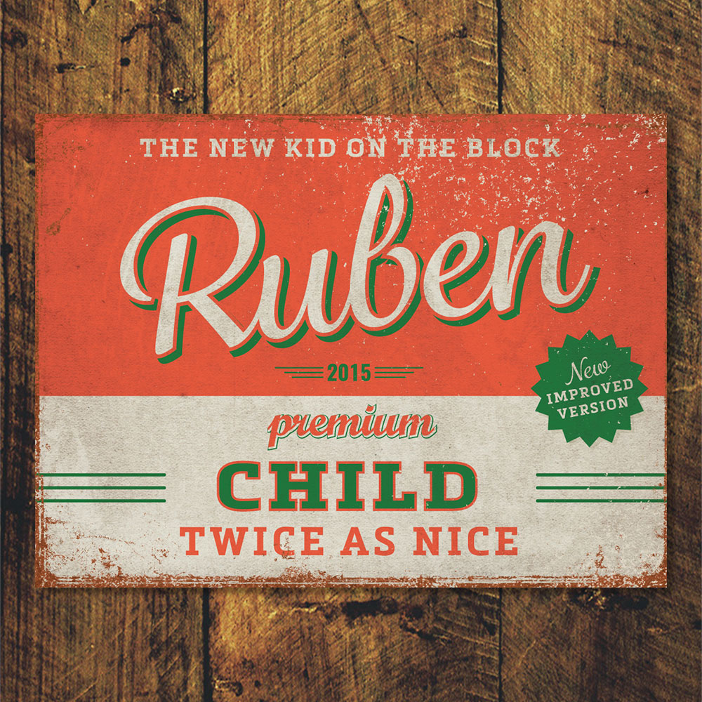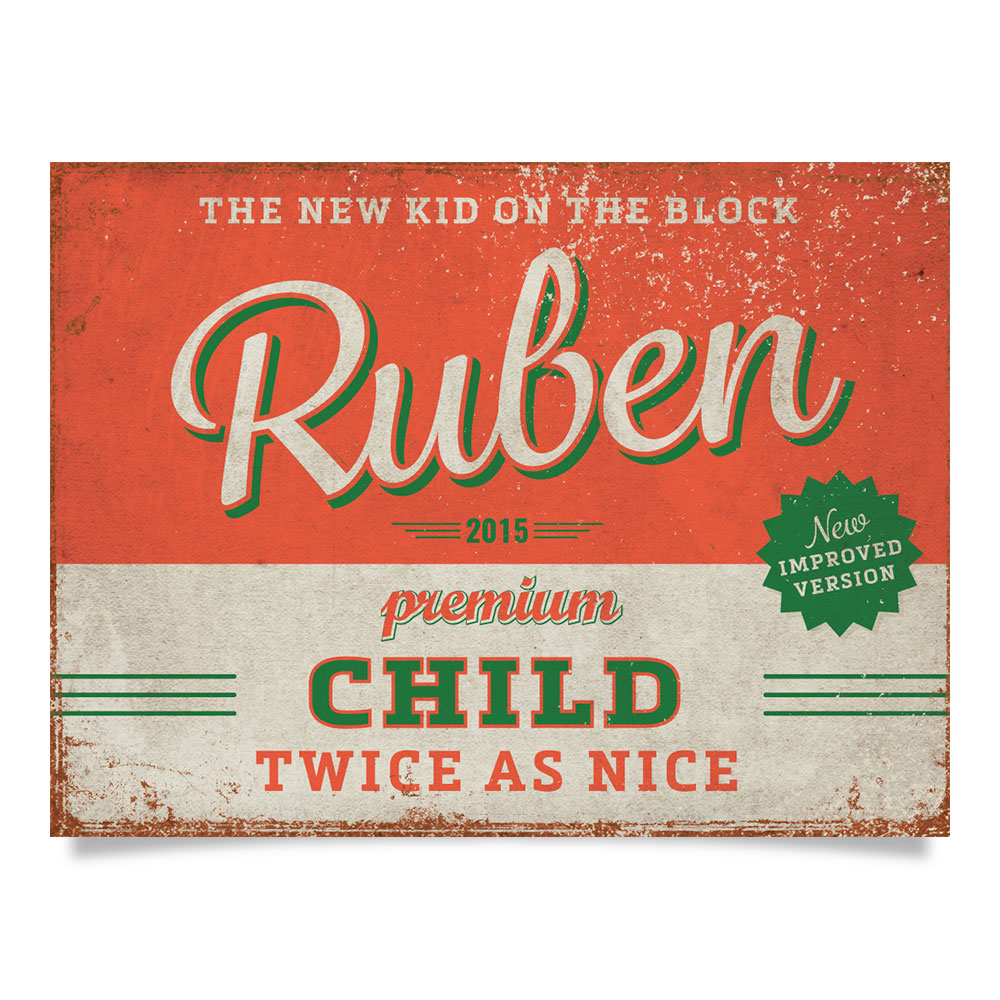 Mooie rood met groen “vintage” poster (Engelstalig reclamebord) met de naam en geboortedatum van uw kind. De print wordt geplakt op zwart dibond (aluminium met zwarte kern). Alle formaten worden met een handig ophanghaakje geleverd. Het liggende formaat staat ook erg mooi op deur van de kinderkamer.