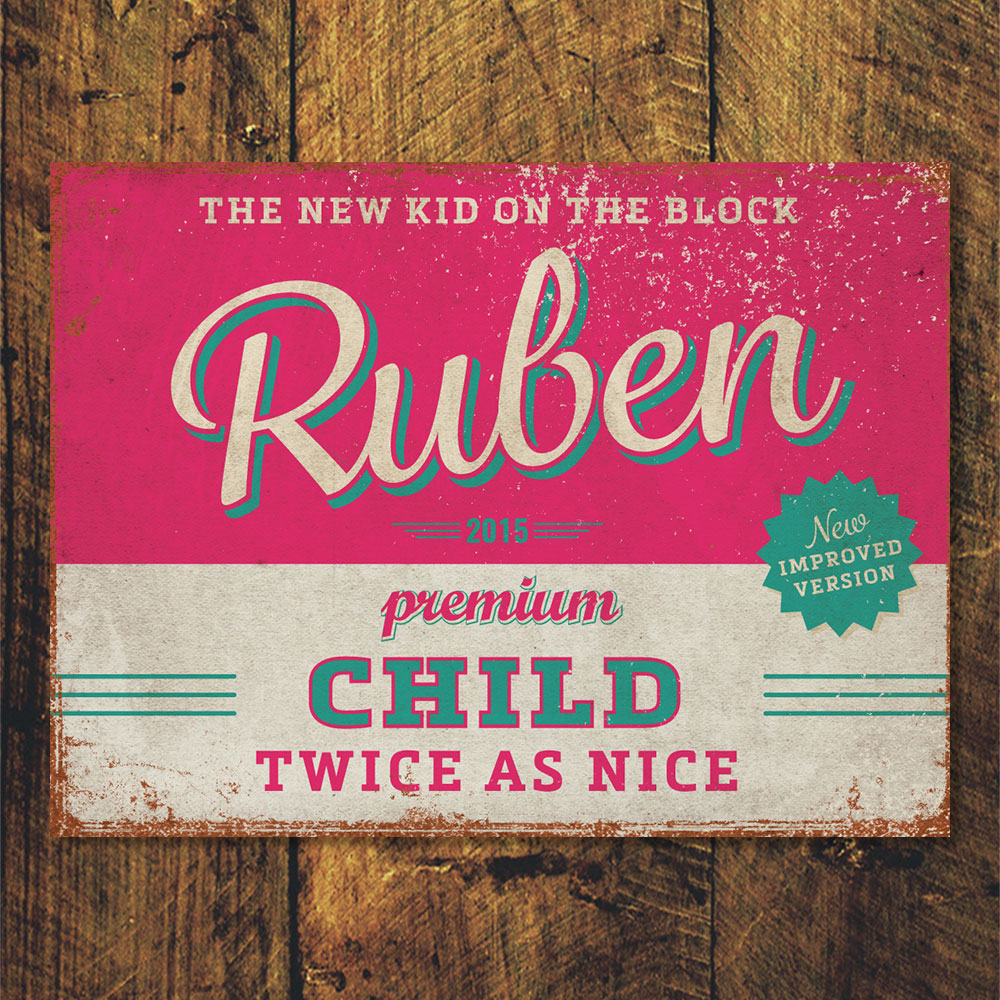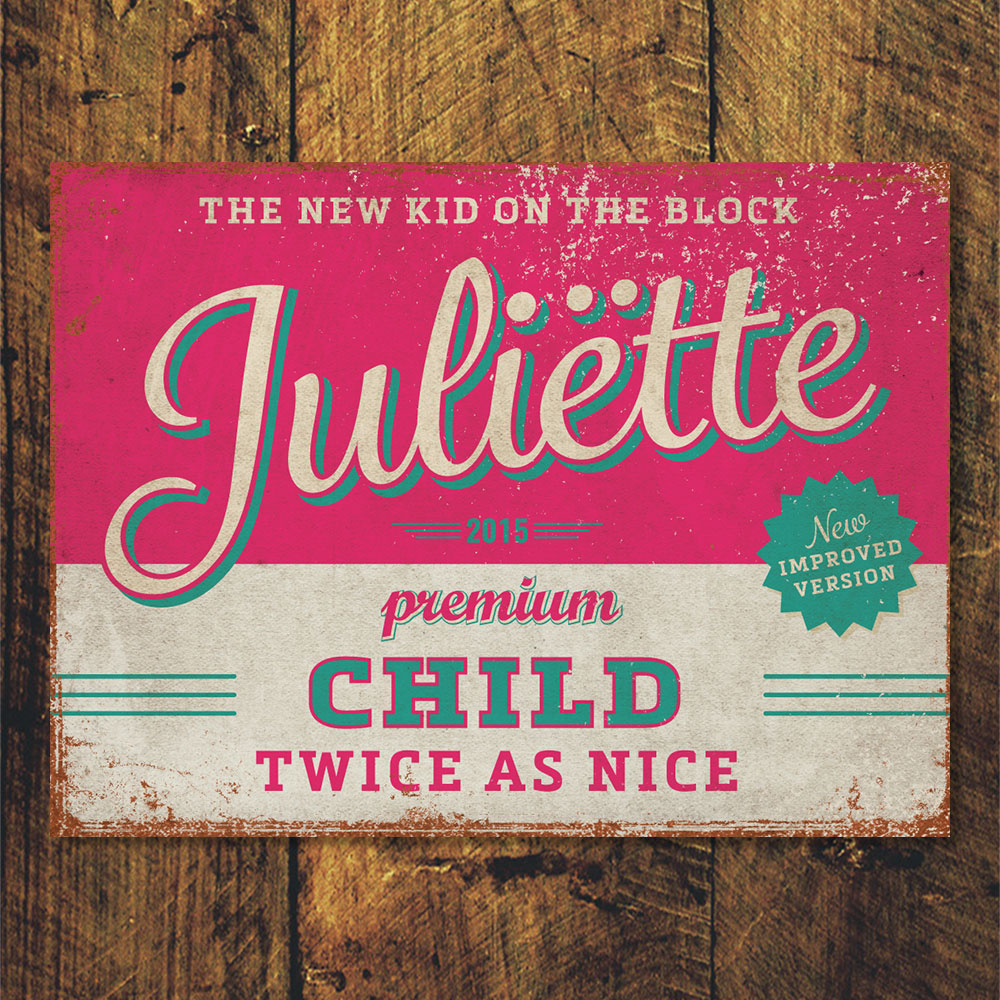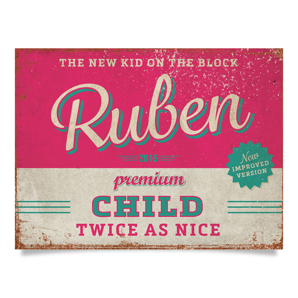 Mooie roze met blauw “vintage” poster (Engelstalig reclamebord) met de naam en geboortedatum van uw kind. De print wordt geplakt op zwart dibond (aluminium met zwarte kern). Alle formaten worden met een handig ophanghaakje geleverd. Het liggende formaat staat ook erg mooi op deur van de kinderkamer.