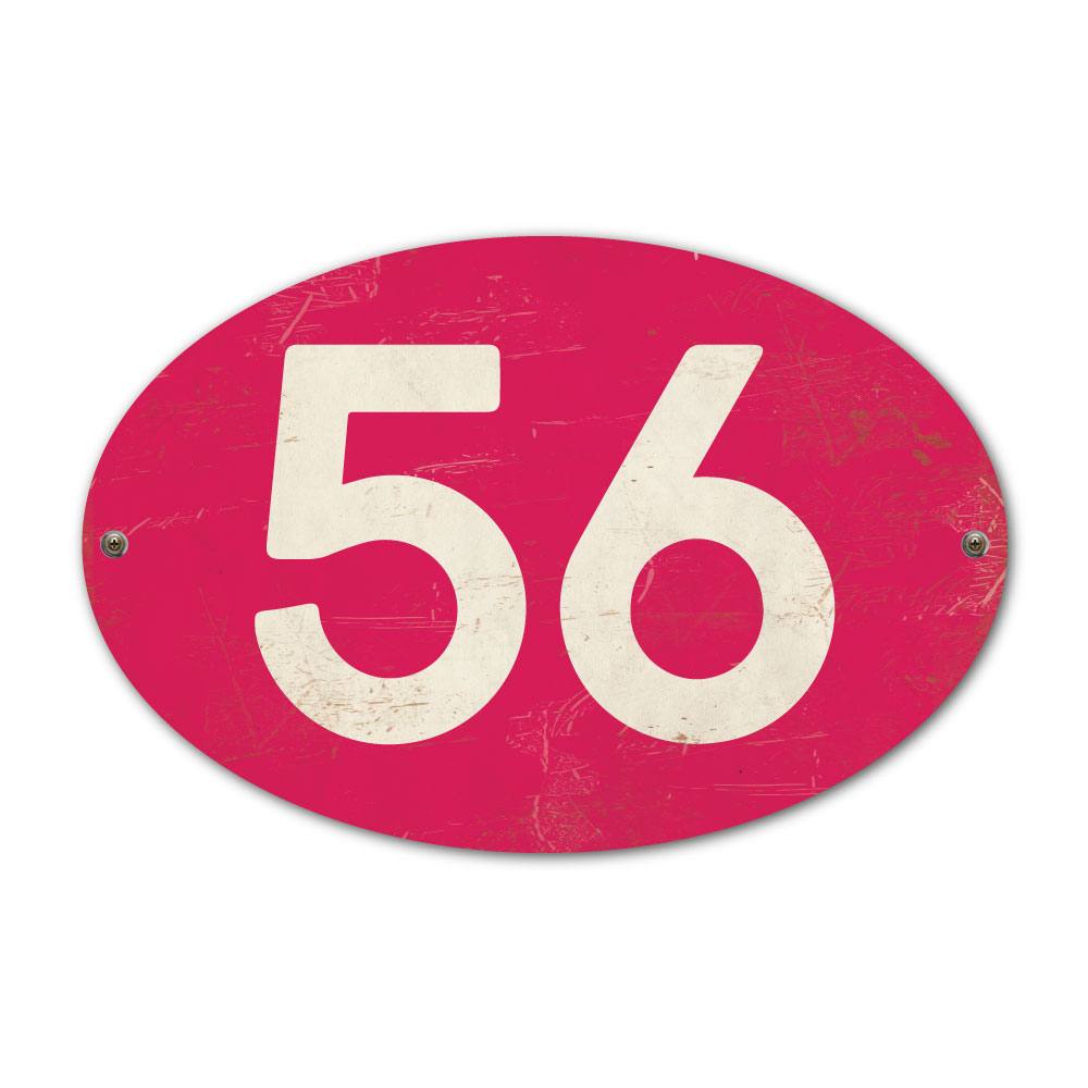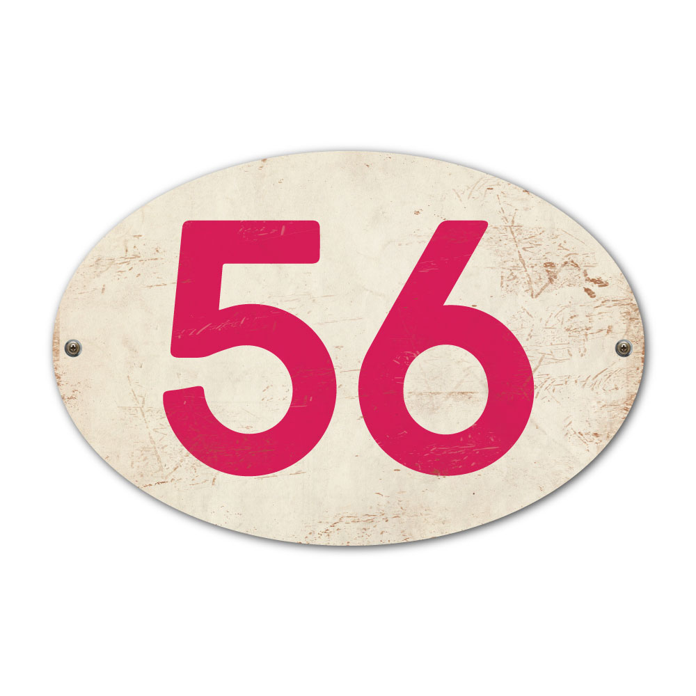 Mooi ovaal (knal)roze “vintage” huisnummerbordje. Stoer en origineel huisnummerbordje voor bij de voordeur van jouw huis. Maar natuurlijk ook leuk en origineel als cadeau voor iemand die net verhuisd is (housewarming). Het huisnummerbordje staat natuurlijk ook tof als cijferbord in je interieur.