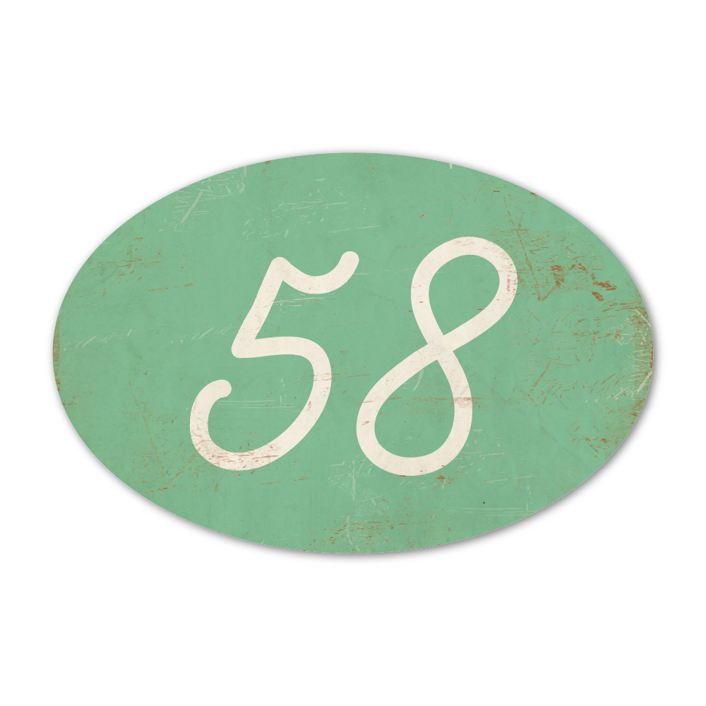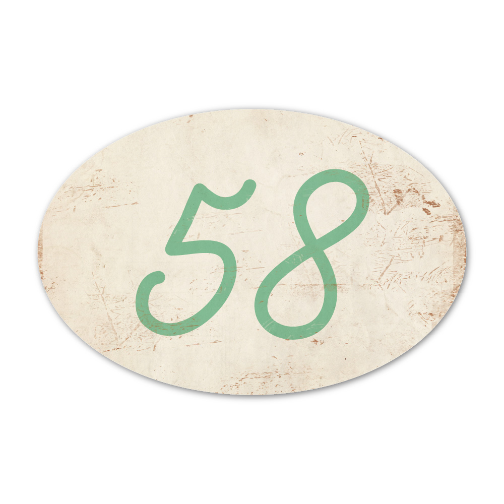 Mooi ovaal mint “vintage” huisnummerbordje. Stoer en origineel huisnummerbordje voor bij de voordeur van jouw huis. Maar natuurlijk ook leuk en origineel als cadeau voor iemand die net verhuisd is (housewarming). Het huisnummerbordje staat natuurlijk ook tof als cijferbord in je interieur.
