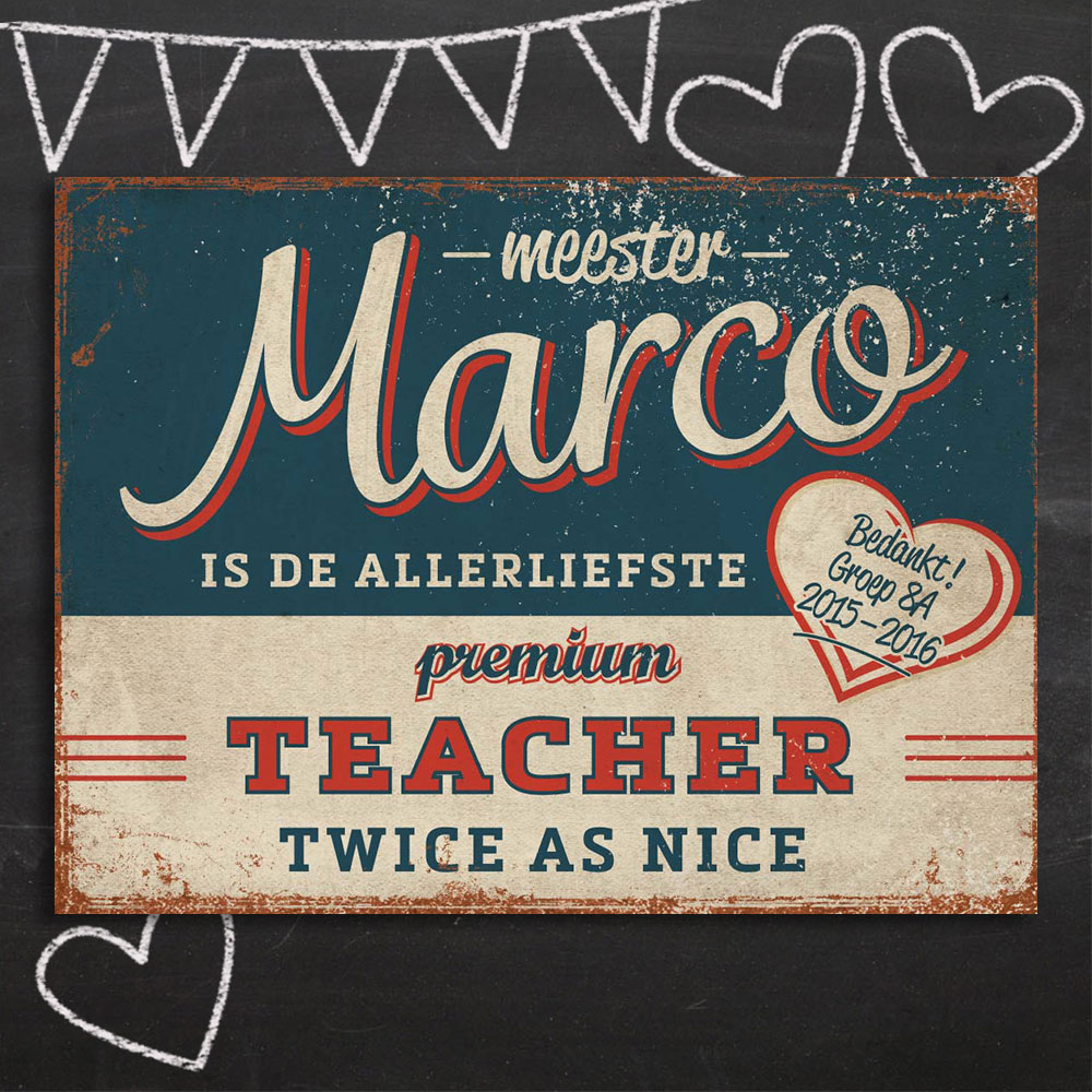 Het einde van het schooljaar komt er weer aan! Daarmee komt er afscheid nemen van de juf of meester. Verras de juf of leraar met een origineel en uniek naambord met leuk teksten. Het is ook mogelijk om eigen teksten in plaats van de standaard teksten op het naambord te zetten.