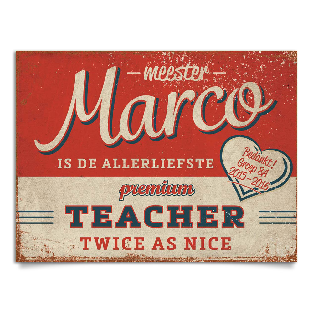 Het einde van het schooljaar komt er weer aan! Daarmee komt er afscheid nemen van de juf of meester. Verras de juf of leraar met een origineel en uniek naambord met leuk teksten. Het is ook mogelijk om eigen teksten in plaats van de standaard teksten op het naambord te zetten.
