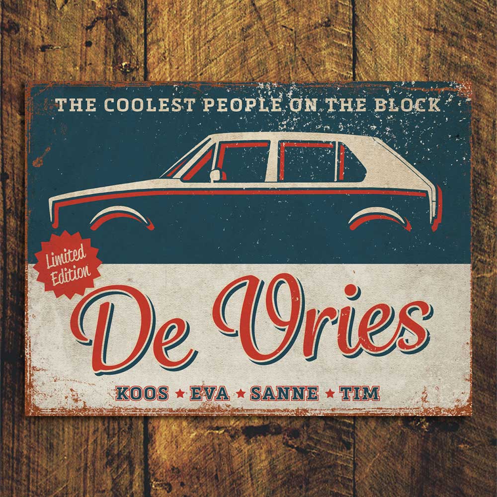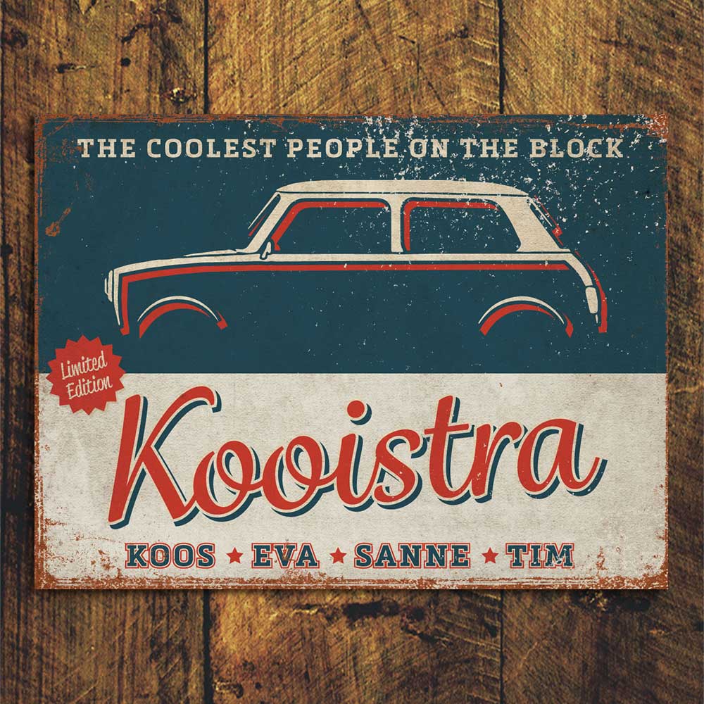 Mooie blauw met rood “vintage” naambordje (Engelstalig reclamebord) met uw lievelingsauto en leuke teksten. Een leuk en origineel cadeau voor iemand die net verhuisd is. maar natuurlijk ook voor uw eigen huis. Hieronder kun je kiezen tussen verschillende varianten van deze kleurencombinatie. De foto van de variant wordt na de keuze automatisch vertoond als voorbeeld. Wil je alleen de voornamen op het bordje, dan mag je bij de achternaam nvt invullen. Na het plaatsen van de bestelling, ontvang je van mij een opzet.