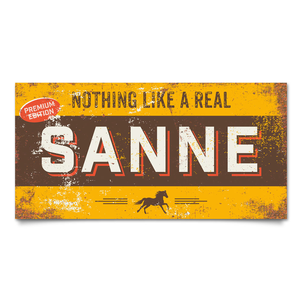 Mooie bruin met geel “vintage” naambord (Engelstalig reclamebord) met de naam van uw kind. Onder de naam kun je kiezen tussen een motor en een paard. Een ander item is op verzoek mogelijk. Het naambord wordt geplakt op dibond (2 lagen aluminium met zwarte kern). Dit naambord wordt geleverd met plakgum zodat je het eenvoudig aan de deur kun bevestigen. Erg mooi en stoer op deur van de kinderkamer.
