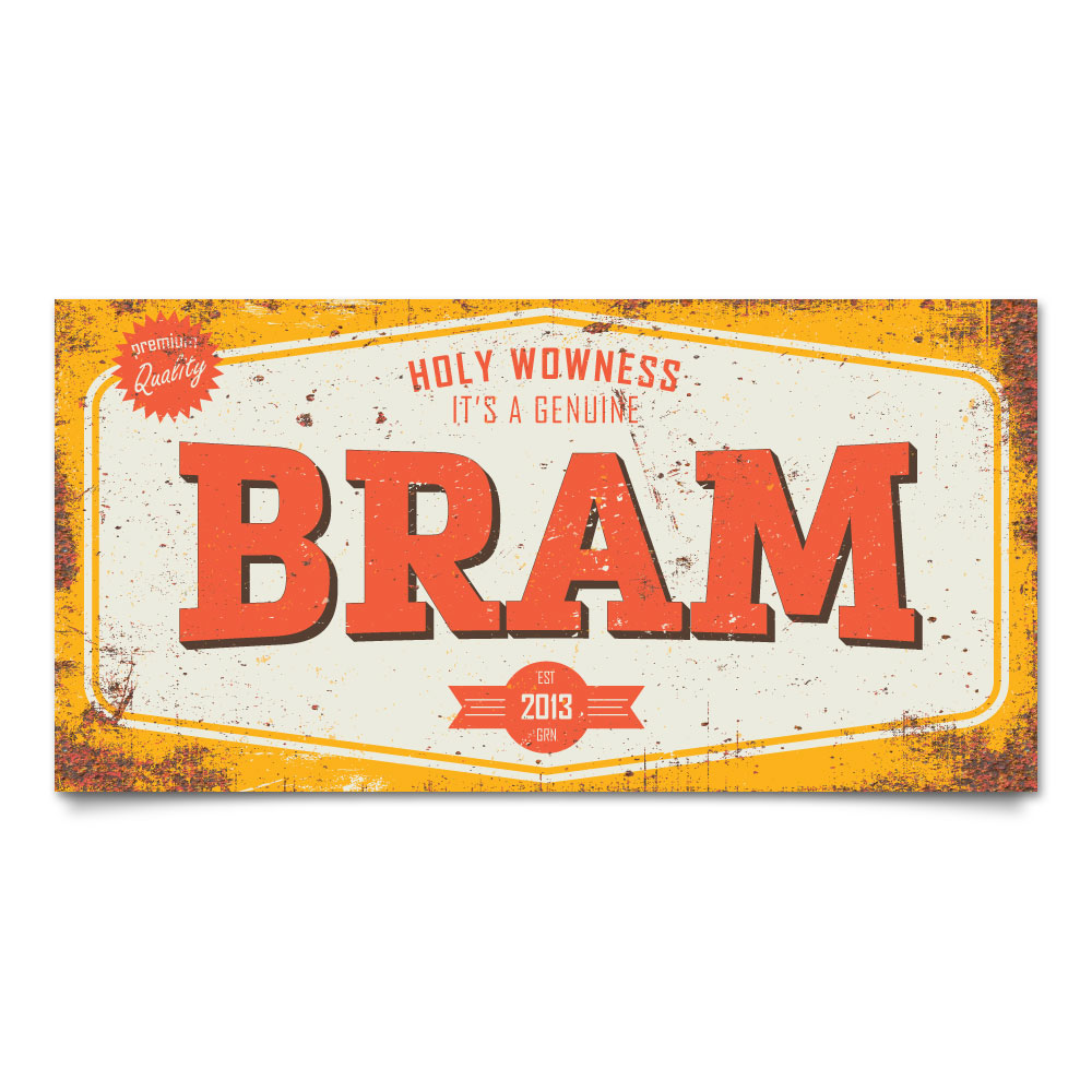 Mooie geel, rood en wit “vintage” naambord (Engelstalig reclamebord) met de naam van uw kind. Het naambord wordt geplakt op dibond (2 lagen aluminium met zwarte kern). Dit naambord wordt geleverd met plakgum zodat je het eenvoudig aan de deur kun bevestigen. Erg mooi en stoer op deur van de kinderkamer.