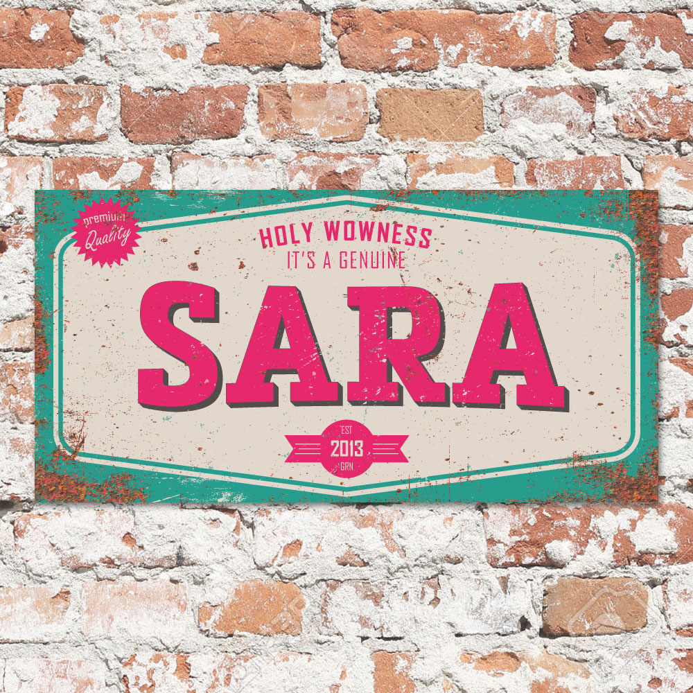 Mooie mint, roze en wit “vintage” naambord (Engelstalig reclamebord) met de naam van uw kind. Het naambord wordt geplakt op dibond (2 lagen aluminium met zwarte kern). Dit naambord wordt geleverd met plakgum zodat je het eenvoudig aan de deur kun bevestigen. Erg mooi en stoer op deur van de kinderkamer.