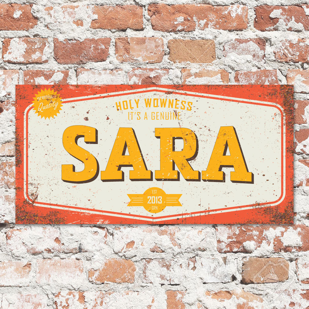 Mooie rood, geel en wit “vintage” naambord (Engelstalig reclamebord) met de naam van uw kind. Het naambord wordt geplakt op dibond (2 lagen aluminium met zwarte kern). Dit naambord wordt geleverd met plakgum zodat je het eenvoudig aan de deur kun bevestigen. Erg mooi en stoer op deur van de kinderkamer.