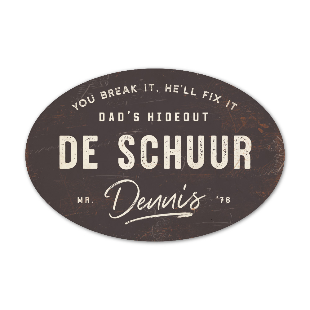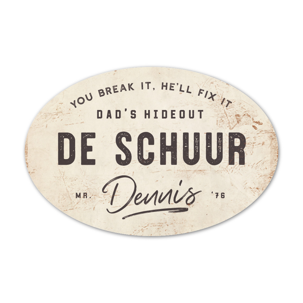 Mooi antraciet met wit “vintage” ovaal naambordje met voornaam. Geïnspireerd door oude borden. Stoer en origineel naambordje voor bij de schuur, garage, mancave of welke plek je man/vriend/vader graag klust. Maar natuurlijk ook leuk en origineel als cadeau voor iemand die gek is van sleutelen in zijn garage of bijvoorbeeld de (nieuwe) mancave.