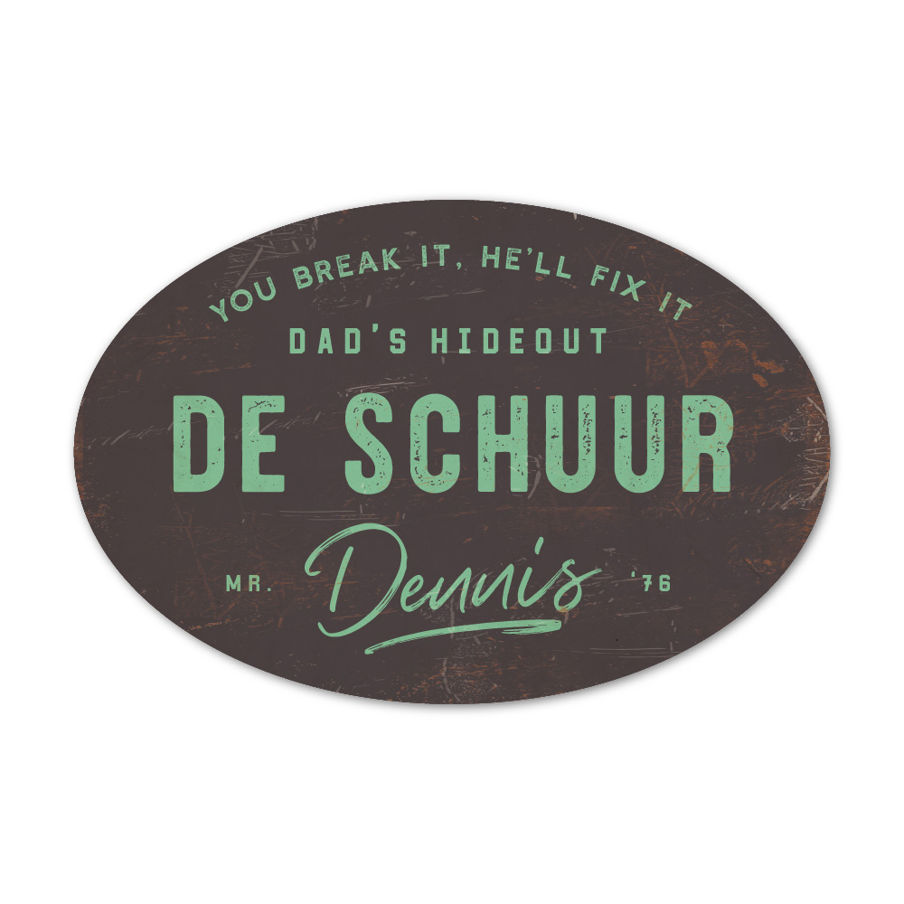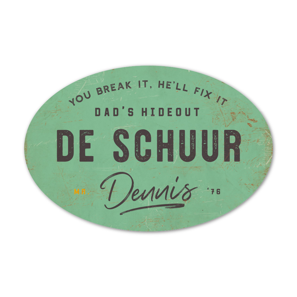 Mooi mint met zwart “vintage” ovaal naambordje met voornaam. Geïnspireerd door oude borden. Stoer en origineel naambordje voor bij de schuur, garage, mancave of welke plek je man/vriend/vader graag klust. Maar natuurlijk ook leuk en origineel als cadeau voor iemand die gek is van sleutelen in zijn garage of bijvoorbeeld de (nieuwe) mancave.