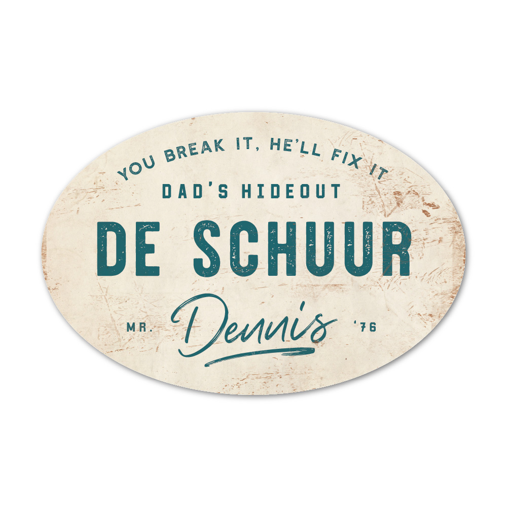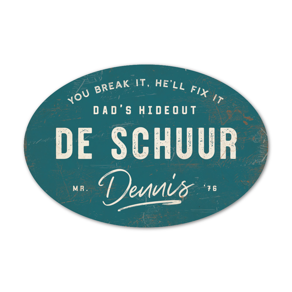 Mooi petrol blauw met wit “vintage” ovaal naambordje met voornaam. Geïnspireerd door oude borden. Stoer en origineel naambordje voor bij de schuur, garage, mancave of welke plek je man/vriend/vader graag klust. Maar natuurlijk ook leuk en origineel als cadeau voor iemand die gek is van sleutelen in zijn garage of bijvoorbeeld de (nieuwe) mancave.