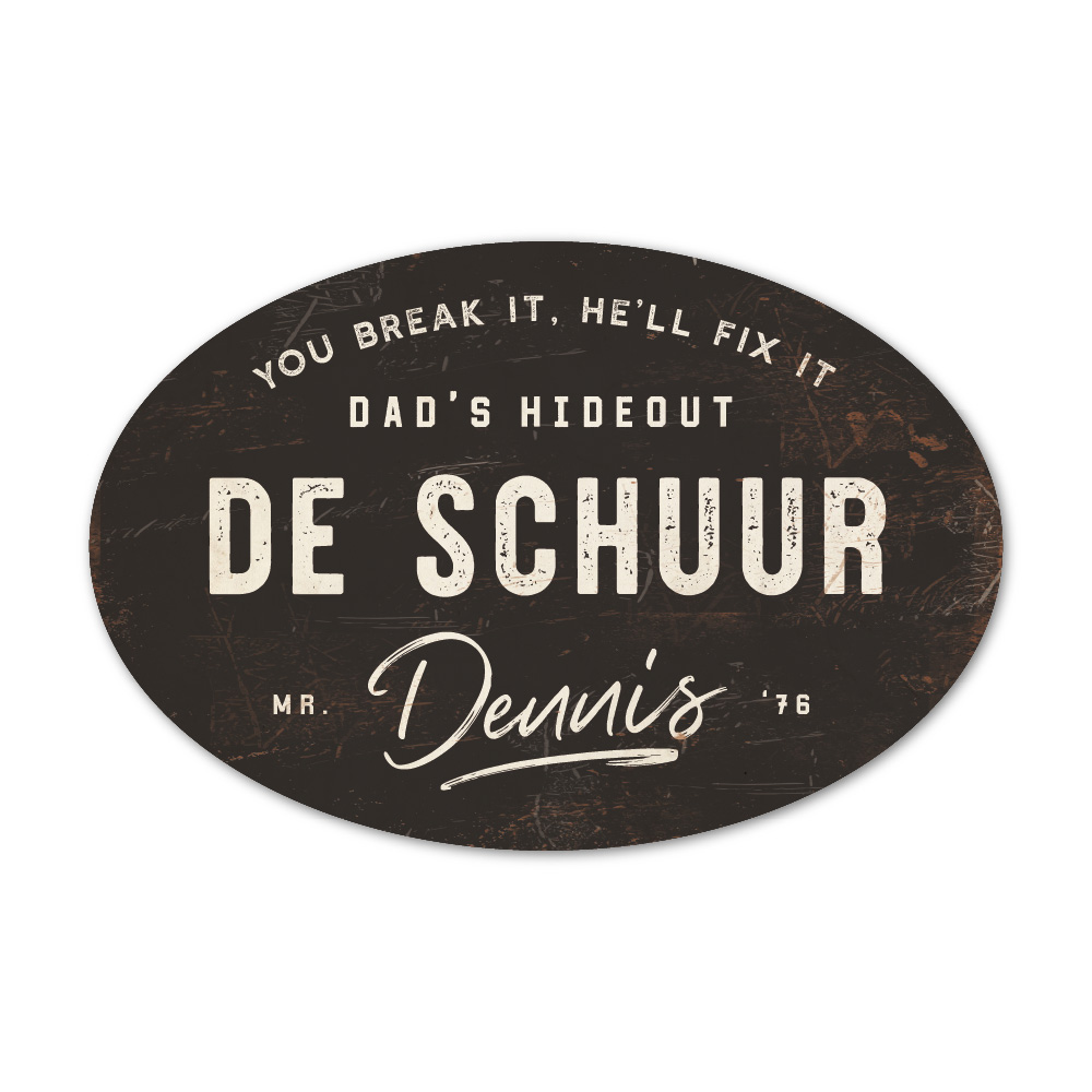 Mooi zwart wit “vintage” ovaal naambordje met voornaam. Geïnspireerd door oude borden. Stoer en origineel naambordje voor bij de schuur, garage, mancave of welke plek je man/vriend/vader graag klust. Maar natuurlijk ook leuk en origineel als cadeau voor iemand die gek is van sleutelen in zijn garage of bijvoorbeeld de (nieuwe) mancave.
