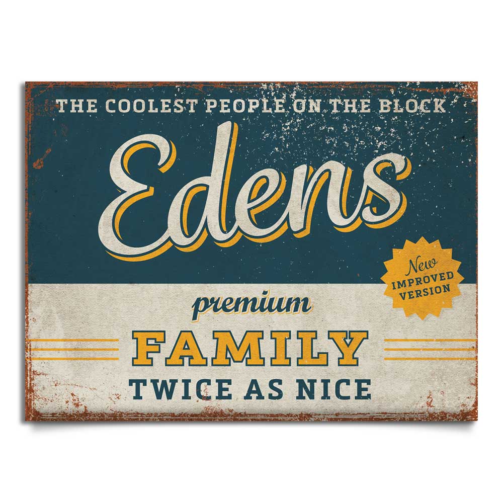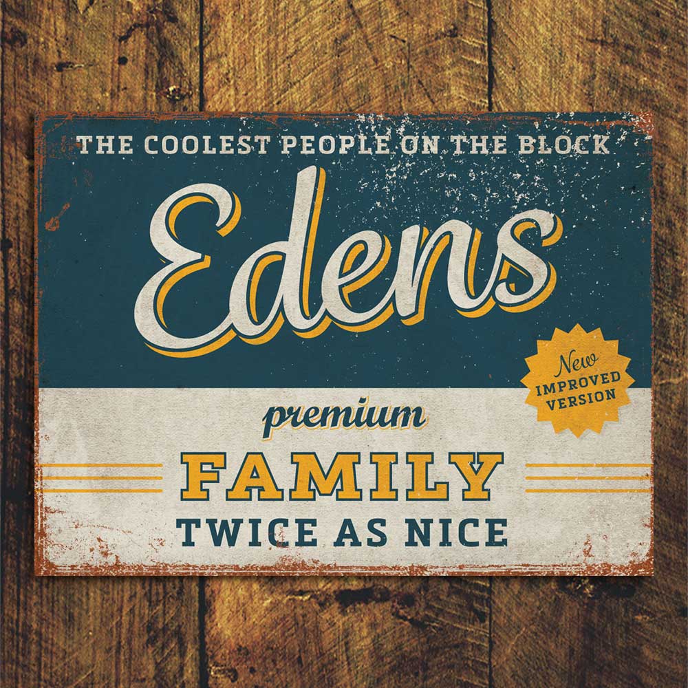 Mooie blauw met geel “vintage” naambordje (Engelstalig reclamebord) met jouw achternaam, voornamen, huisnummer en leuke teksten. Een leuk en origineel cadeau voor iemand die net verhuisd is. maar natuurlijk ook voor uw eigen huis. Hieronder kun je kiezen tussen verschillende varianten van deze kleurencombinatie. De foto van de variant wordt na de keuze automatisch vertoond als voorbeeld. Wil je alleen de voornamen op het bordje, dan mag je bij de achternaam nvt invullen. Na het plaatsen van de bestelling, ontvang je van mij een opzet.