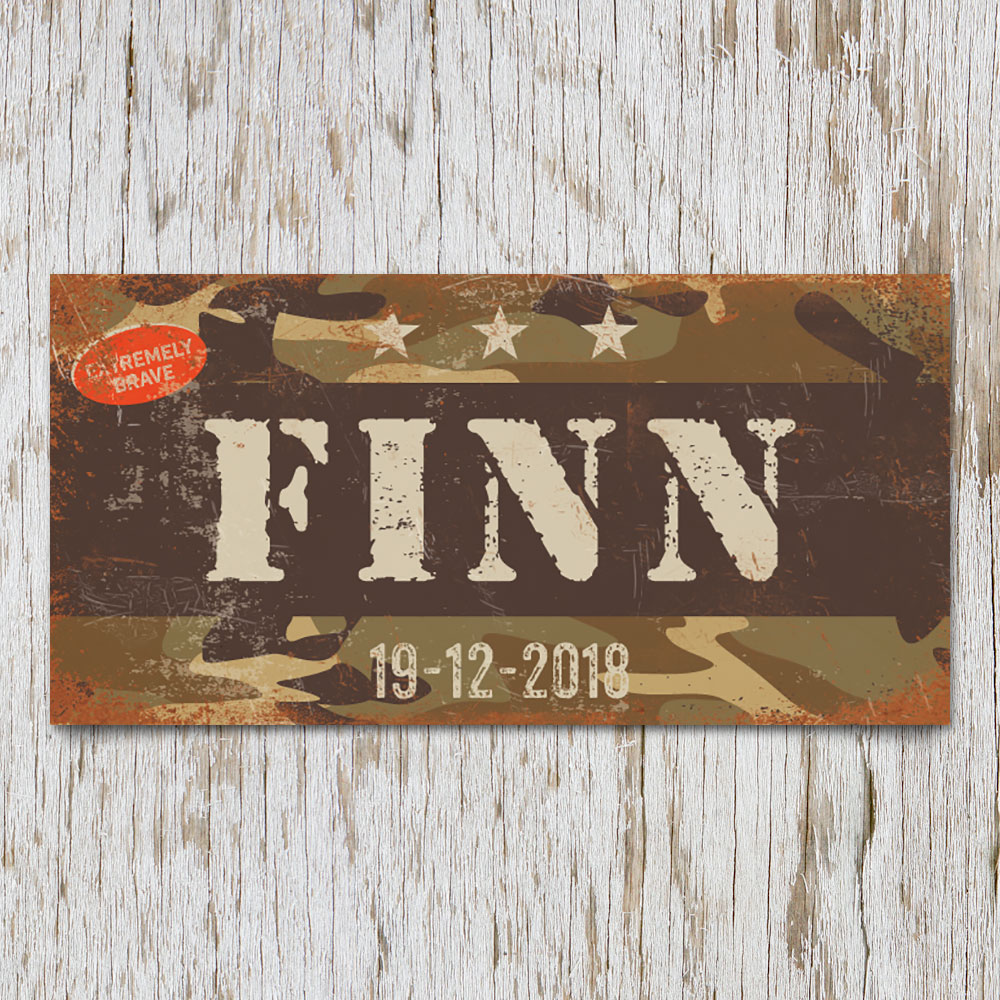 Stoer wit met bruin en camouflage patroon “vintage” leger naambord (Engelstalig reclamebord) met de naam van uw kind. Het naambord wordt geplakt op dibond (2 lagen aluminium met zwarte kern). Dit naambord wordt geleverd met plakgum zodat je het eenvoudig aan de deur kun bevestigen. Erg mooi en stoer op deur van de kinderkamer.