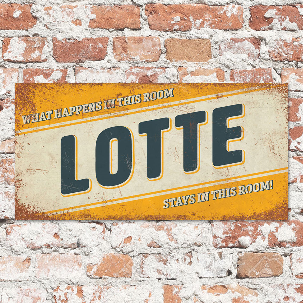Mooie geel, zwart en wit “vintage” naambord (Engelstalig reclamebord) met de naam van uw kind. Het naambord wordt geplakt op dibond (2 lagen aluminium met zwarte kern). Dit naambord wordt geleverd met plakgum zodat je het eenvoudig aan de deur kun bevestigen. Erg mooi en stoer op deur van de kinderkamer.