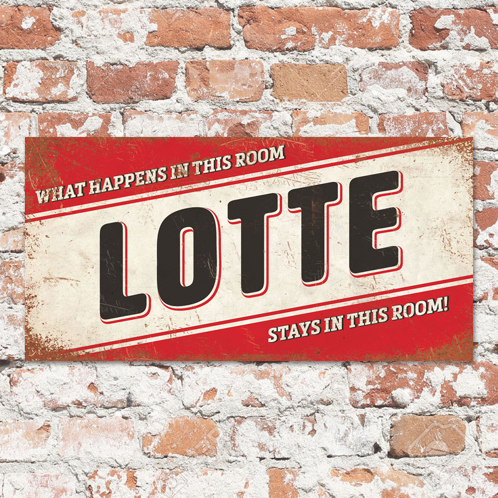Mooie rood, zwart en wit “vintage” naambord (Engelstalig reclamebord) met de naam van uw kind. Het naambord wordt geplakt op dibond (2 lagen aluminium met zwarte kern). Dit naambord wordt geleverd met plakgum zodat je het eenvoudig aan de deur kun bevestigen. Erg mooi en stoer op deur van de kinderkamer.