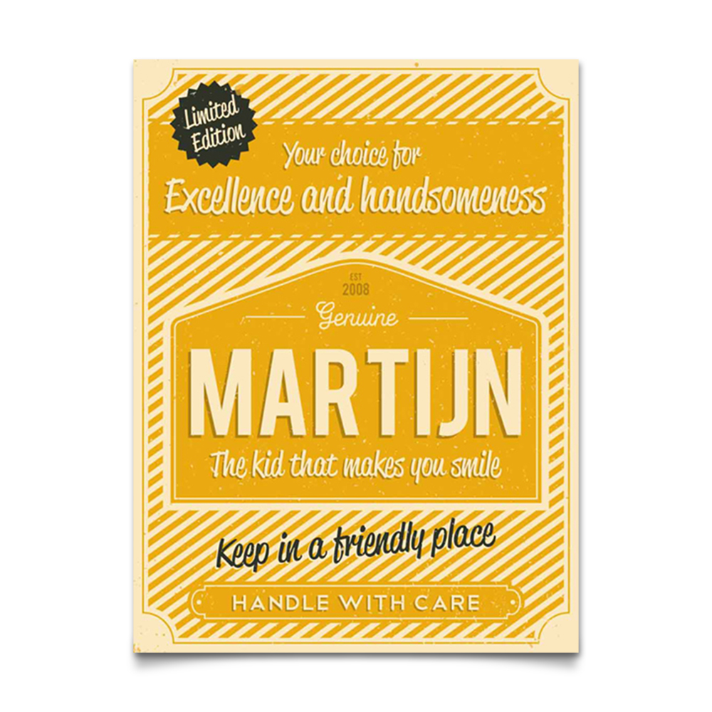 Mooie gele “vintage” poster (Engelstalig reclamebord) met de naam en geboortedatum van uw kind. De print wordt geplakt op zwart dibond (aluminium met zwarte kern). Alle formaten worden met een handig ophanghaakje geleverd.