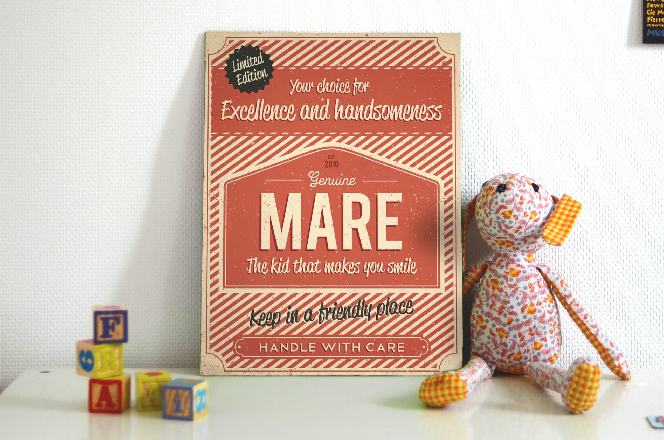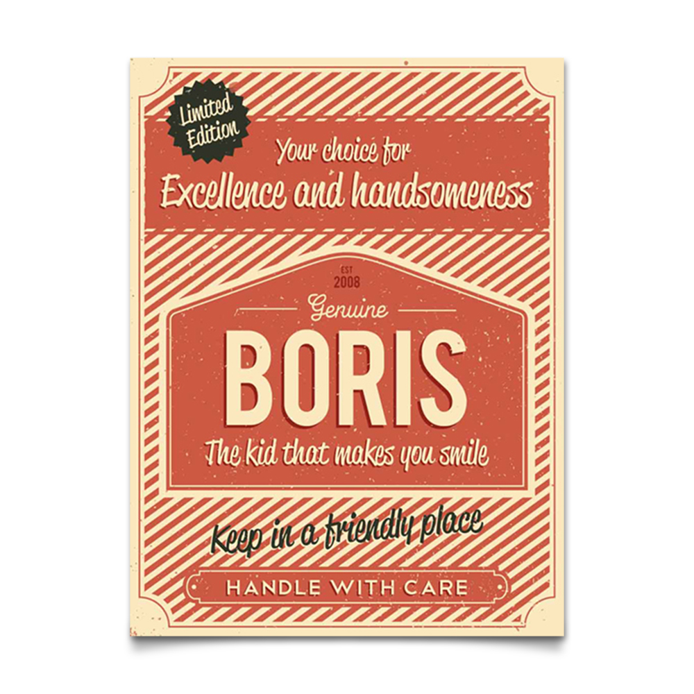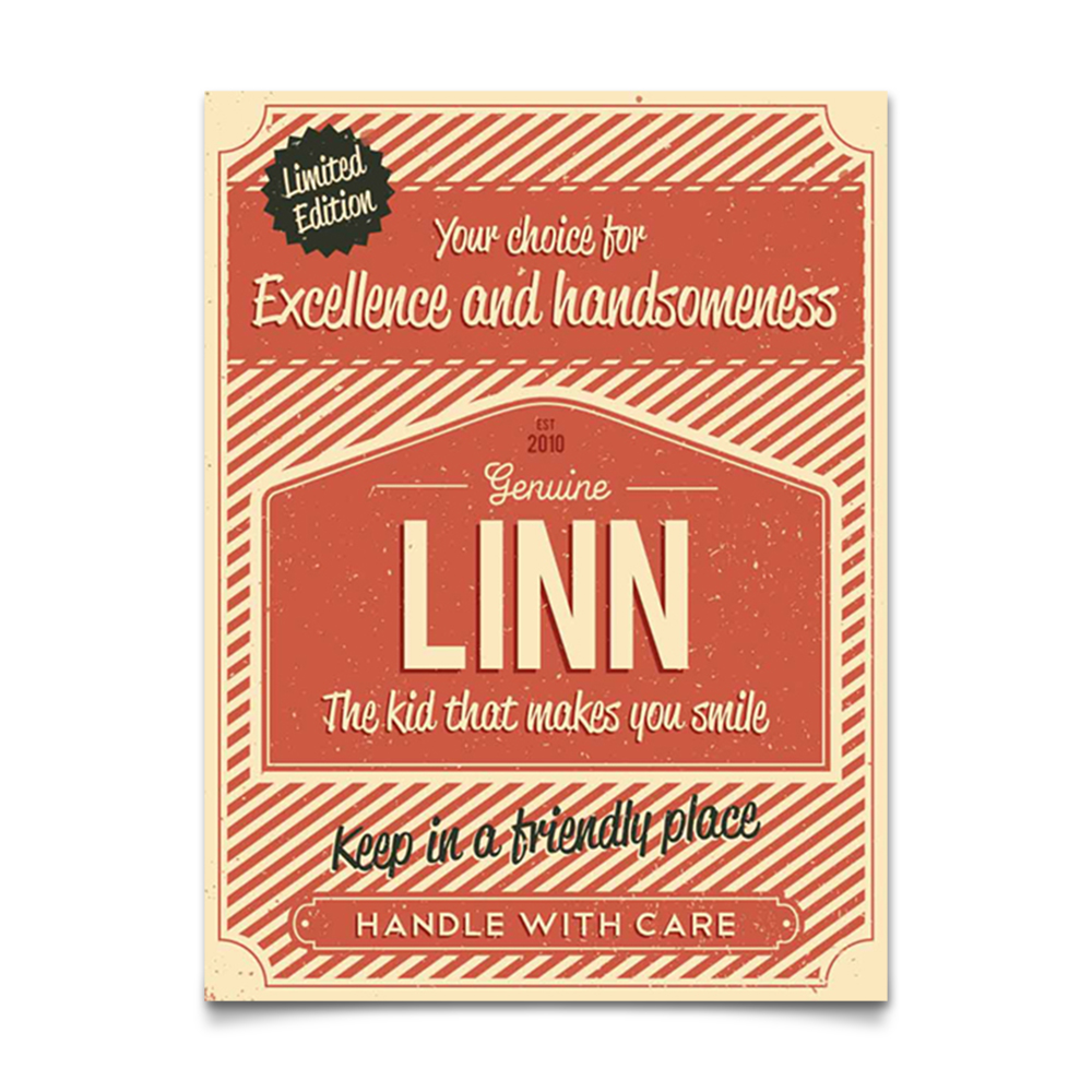 Mooie rode “vintage” poster (Engelstalig reclamebord) met de naam en geboortedatum van uw kind. De print wordt geplakt op zwart dibond (aluminium met zwarte kern). Alle formaten worden met een handig ophanghaakje geleverd.