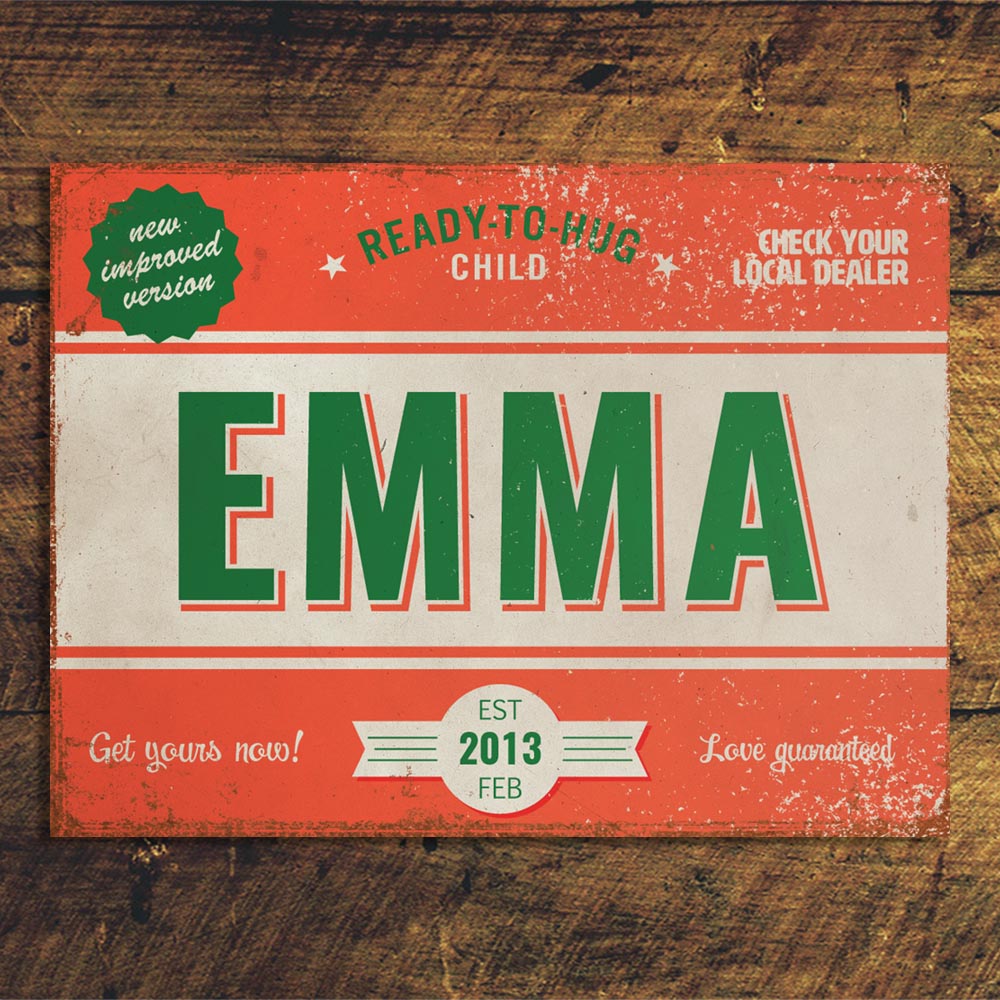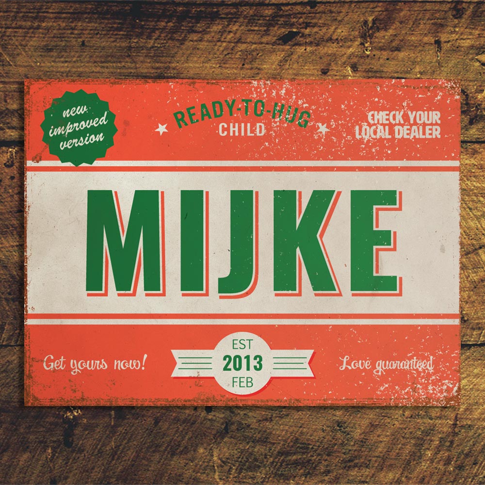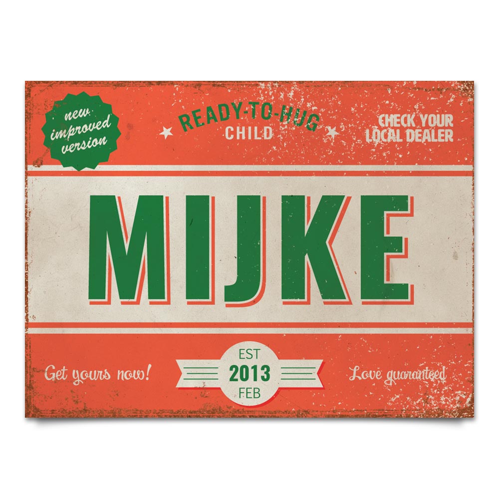 Mooie rood met groen “vintage” poster (Engelstalig reclamebord) met de naam en geboortedatum van uw kind. De print wordt geplakt op zwart dibond (aluminium met zwarte kern). Alle formaten worden met een handig ophanghaakje geleverd. Het liggende formaat staat ook erg mooi op deur van de kinderkamer.