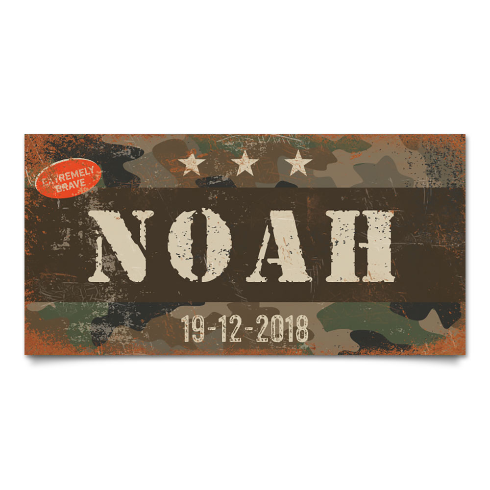 Stoer bruin met wit en camouflage patroon “vintage” leger naambord  (Engelstalig reclamebord) met de naam van uw kind. Het naambord wordt geplakt op dibond (2 lagen aluminium met zwarte kern). Dit naambord wordt geleverd met plakgum zodat je het eenvoudig aan de deur kun bevestigen. Erg mooi en stoer op deur van de kinderkamer.