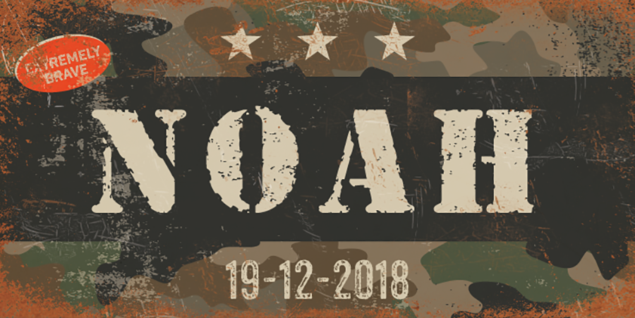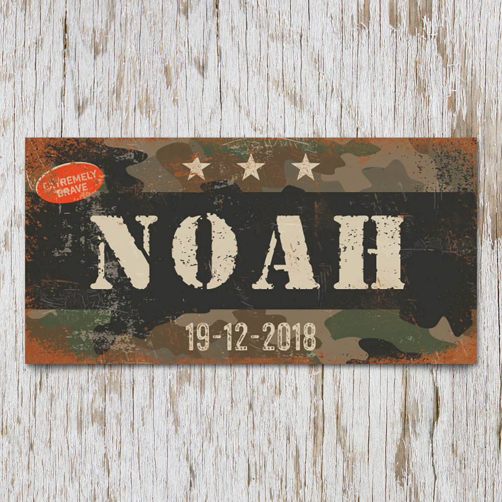 Stoer zwart met wit en camouflage patroon “vintage” leger naambord (Engelstalig reclamebord) met de naam van uw kind. Het naambord wordt geplakt op dibond (2 lagen aluminium met zwarte kern). Dit naambord wordt geleverd met plakgum zodat je het eenvoudig aan de deur kun bevestigen. Erg mooi en stoer op deur van de kinderkamer.