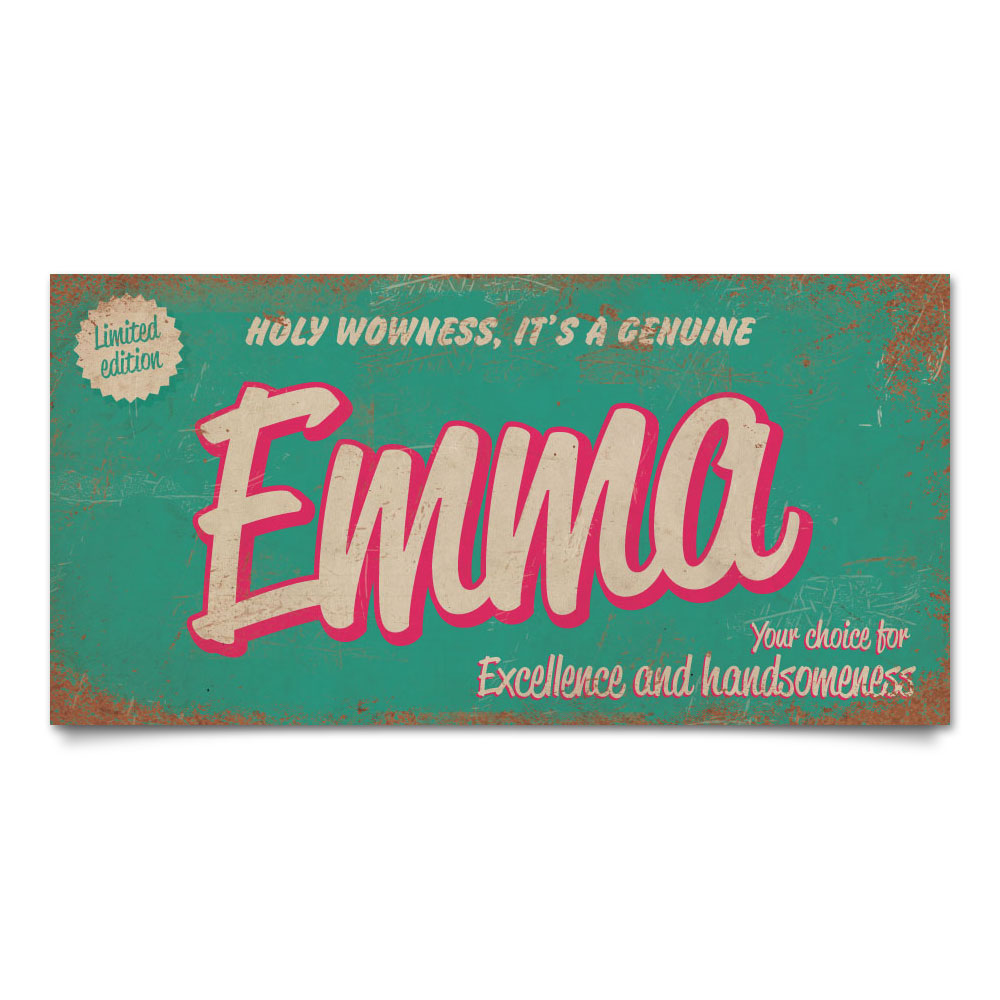 Mooie mint met roze “vintage” naambord (Engelstalig reclamebord) met de naam en geboortedatum van uw kind. Het naambord wordt geplakt op dibond (2 lagen aluminium met zwarte kern). Dit naambord wordt geleverd met plakgum zodat je het eenvoudig aan de deur kun bevestigen. Erg mooi en stoer op deur van de kinderkamer.