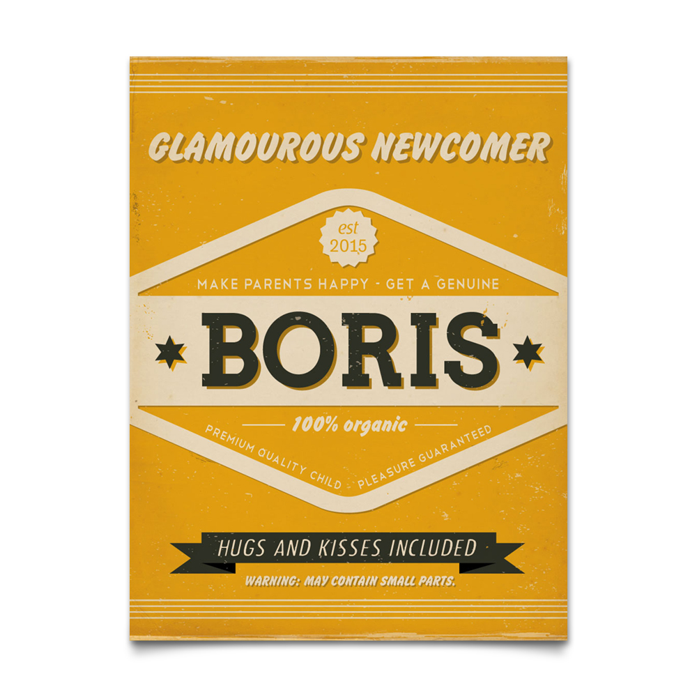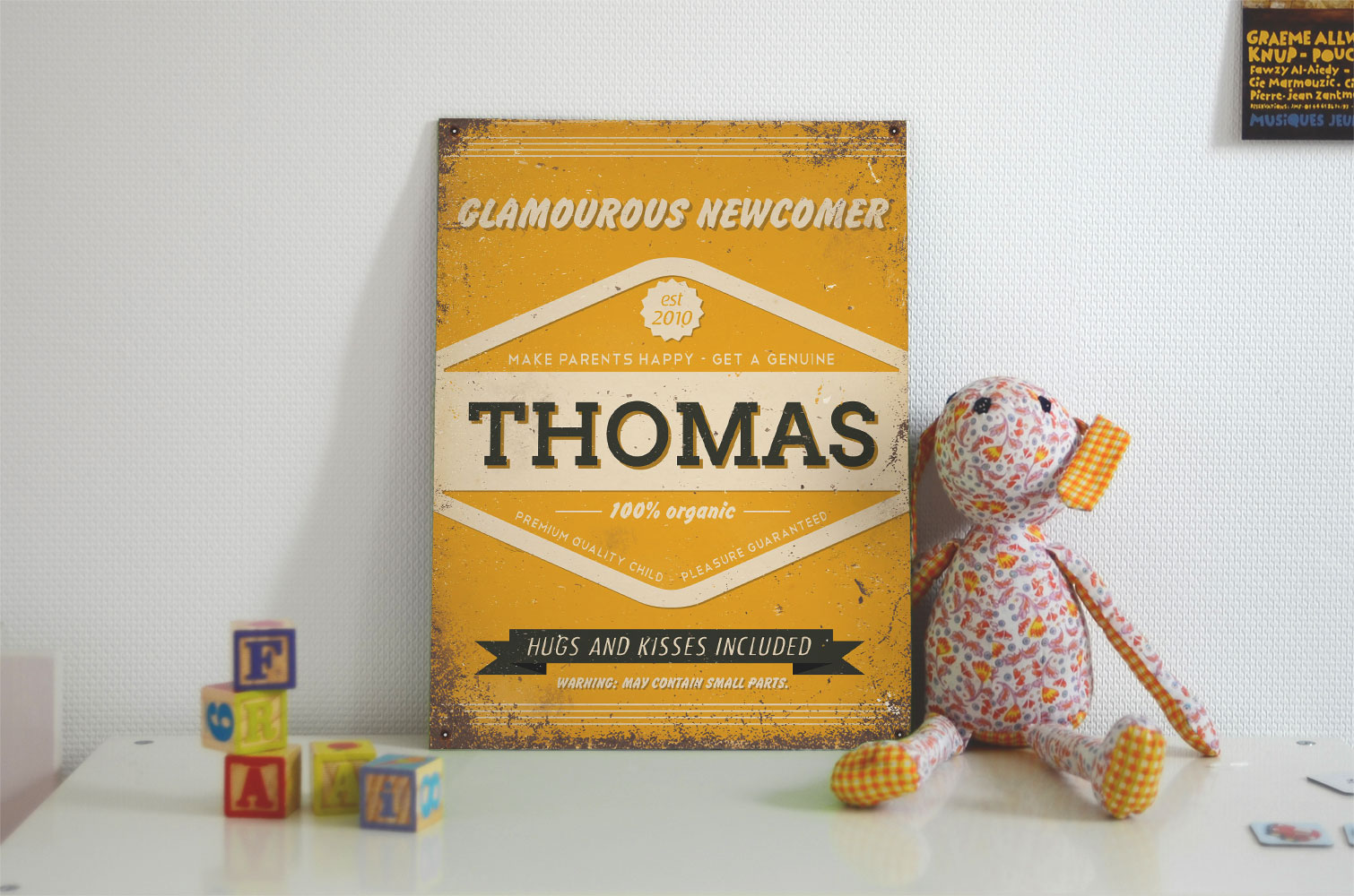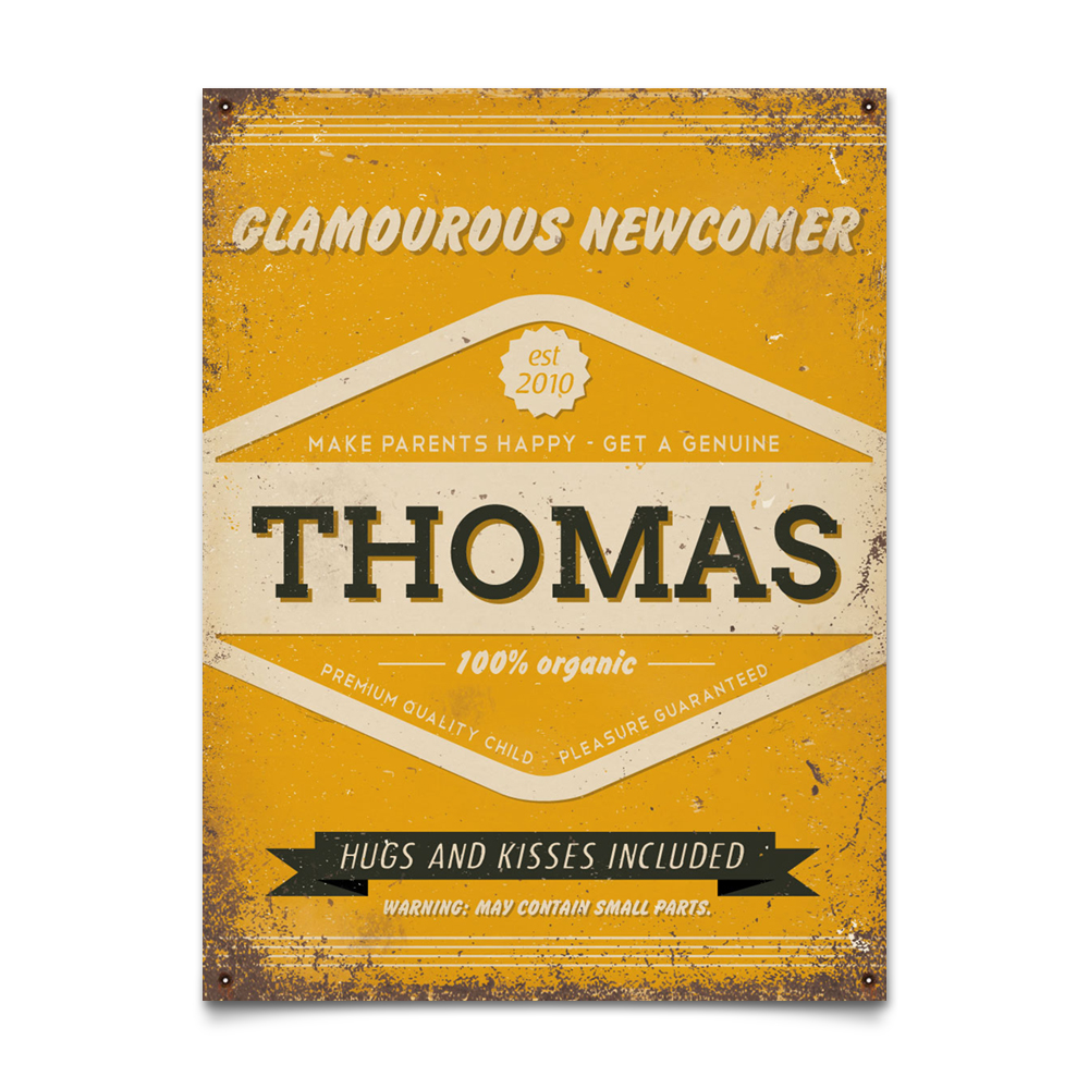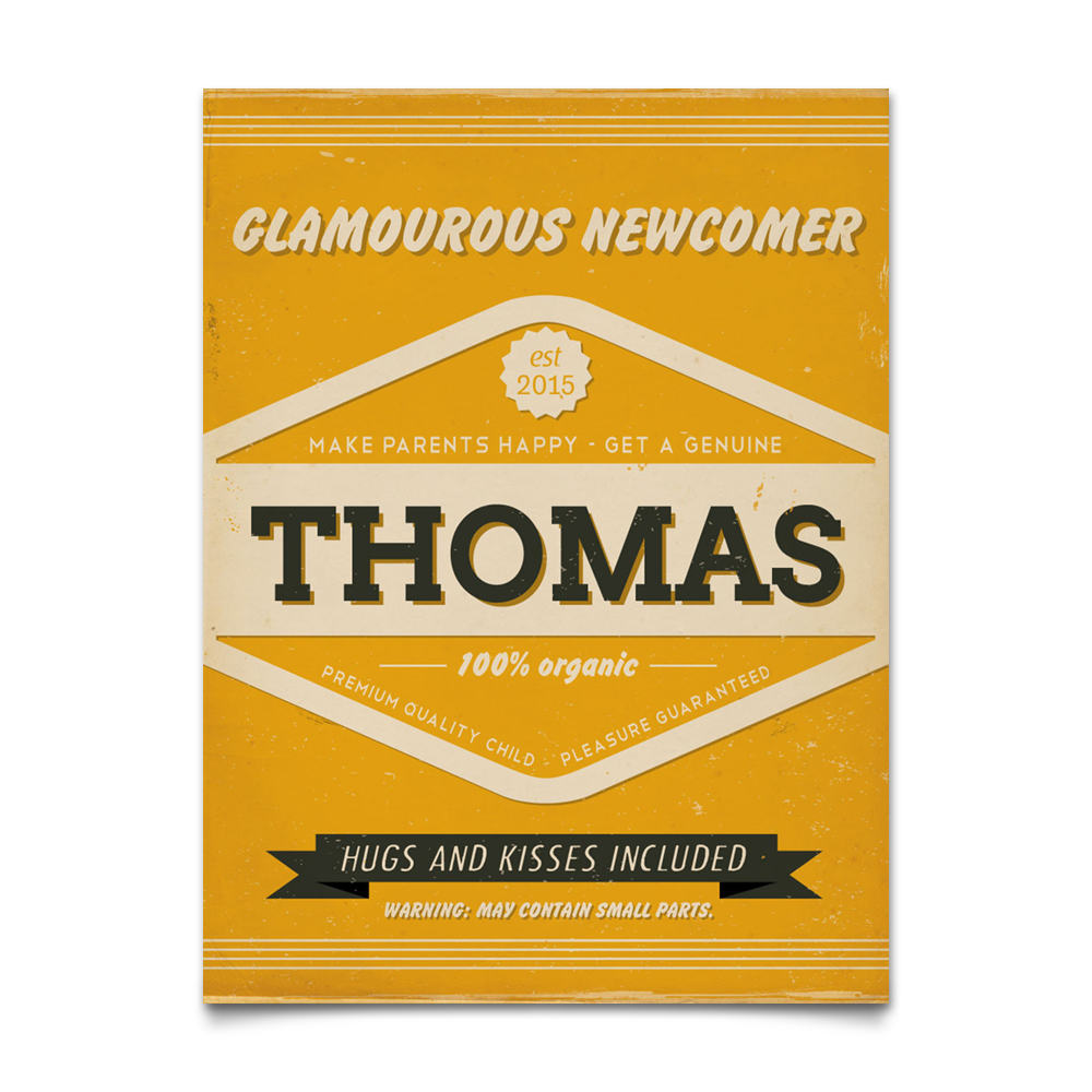 Mooie gele “vintage” poster (Engelstalig reclamebord) met de naam en geboortedatum van uw kind. De print wordt geplakt op zwart dibond (aluminium met zwarte kern). Alle formaten worden met een handig ophanghaakje geleverd.