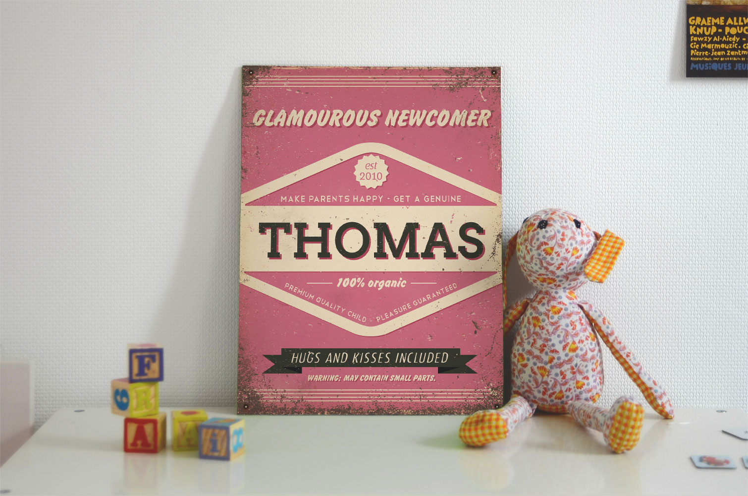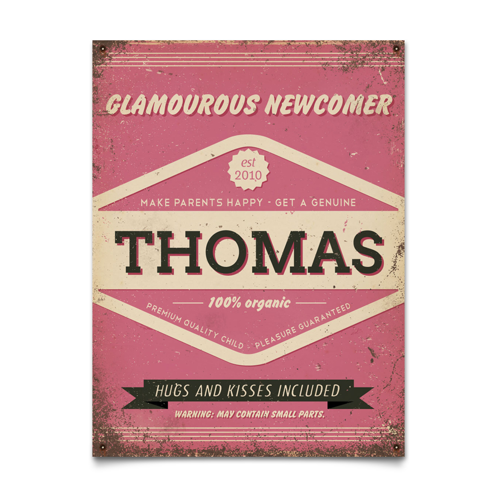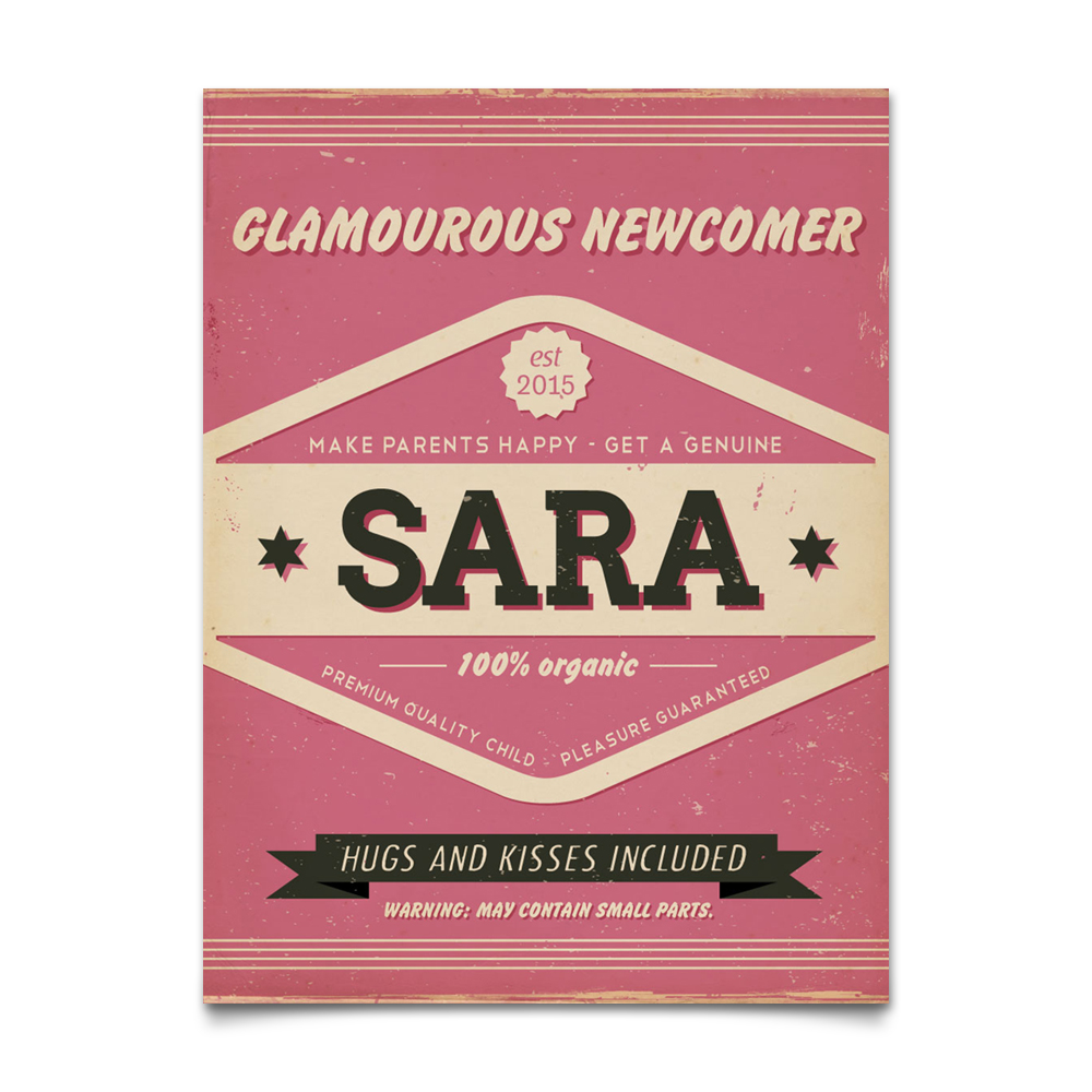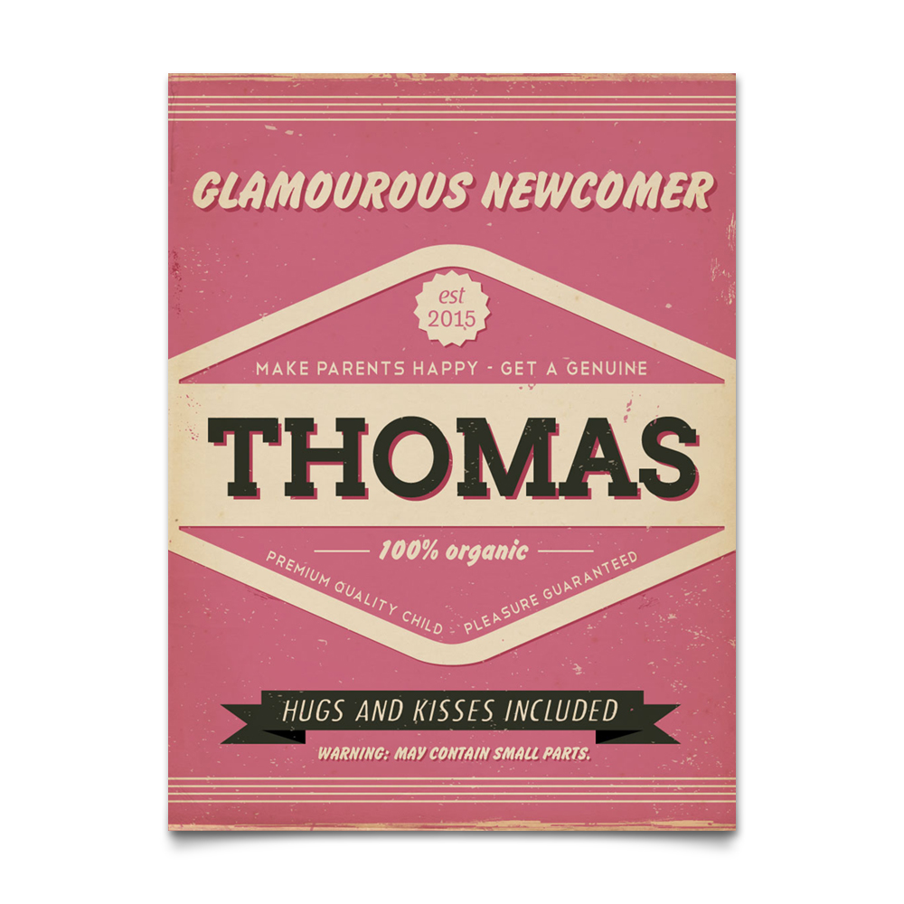 Mooie roze “vintage” poster (Engelstalig reclamebord) met de naam en geboortedatum van uw kind. De print wordt geplakt op zwart dibond (aluminium met zwarte kern). Alle formaten worden met een handig ophanghaakje geleverd.