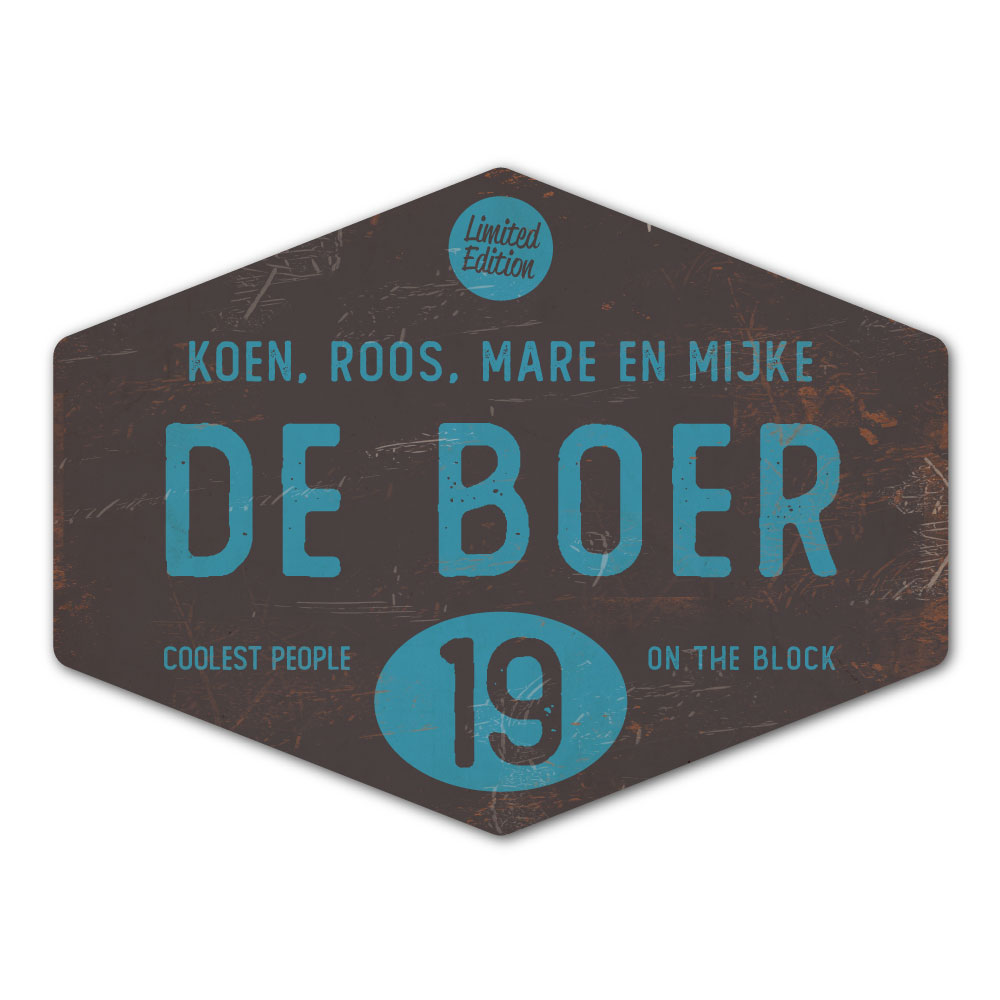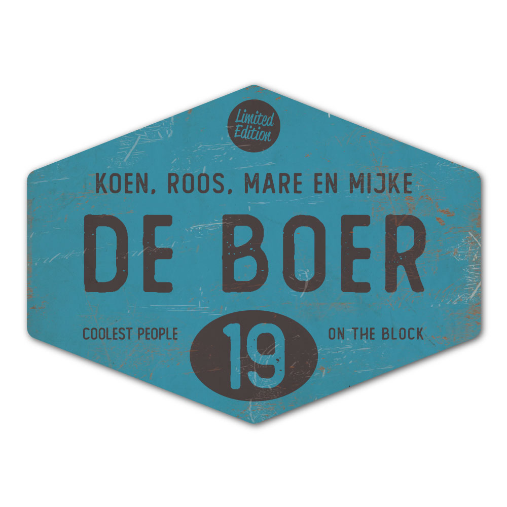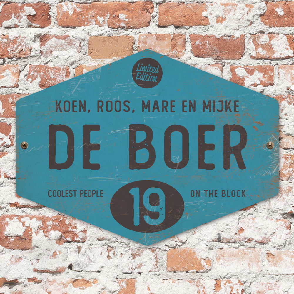 Mooi blauw en zwart “vintage” naambordje in een ruitvorm met jouw achternaam, voornamen, huisnummer en leuke teksten. Stoer en origineel naambordje voor bij de voordeur van jouw huis. Maar natuurlijk ook leuk en origineel als cadeau voor iemand die net verhuisd is (housewarming).