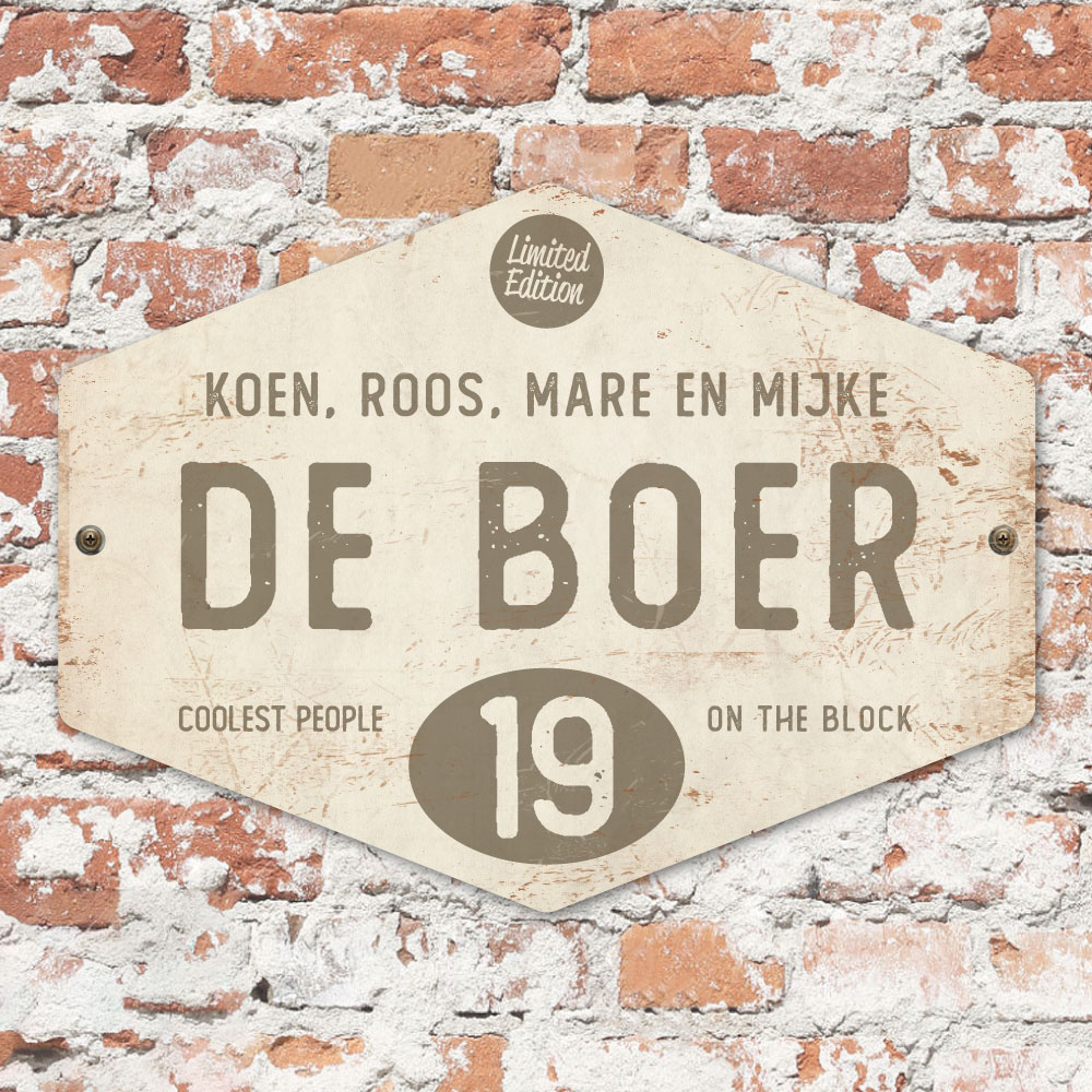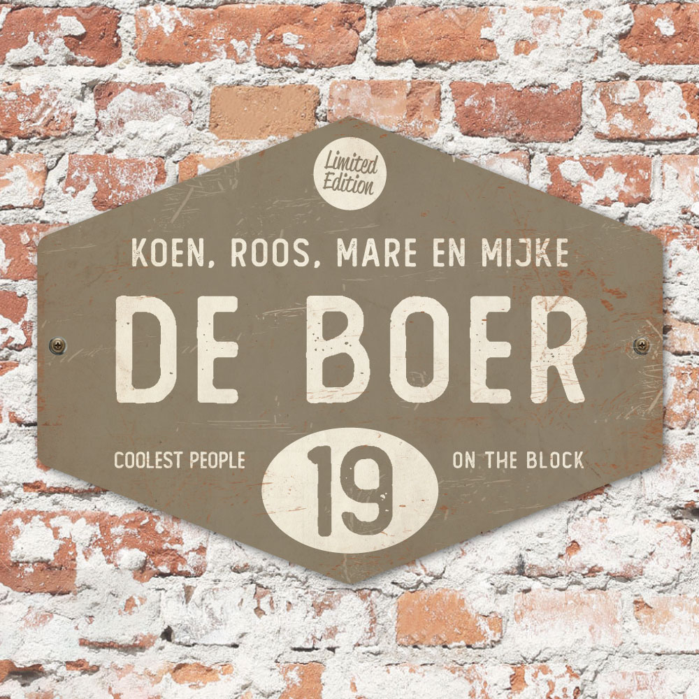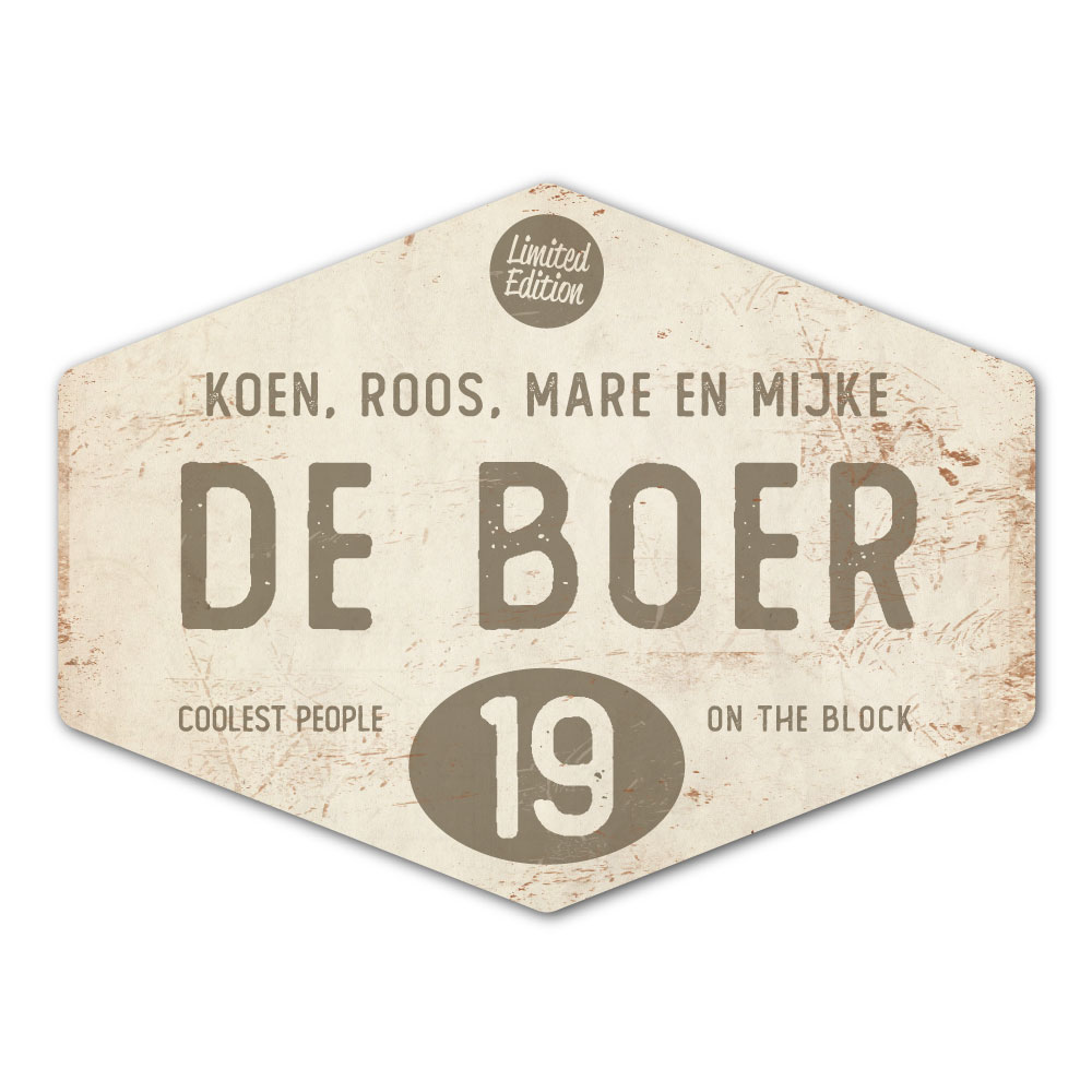 Mooi grijs en wit “vintage” naambordje in een ruitvorm met jouw achternaam, voornamen, huisnummer en leuke teksten. Stoer en origineel naambordje voor bij de voordeur van jouw huis. Maar natuurlijk ook leuk en origineel als cadeau voor iemand die net verhuisd is (housewarming).