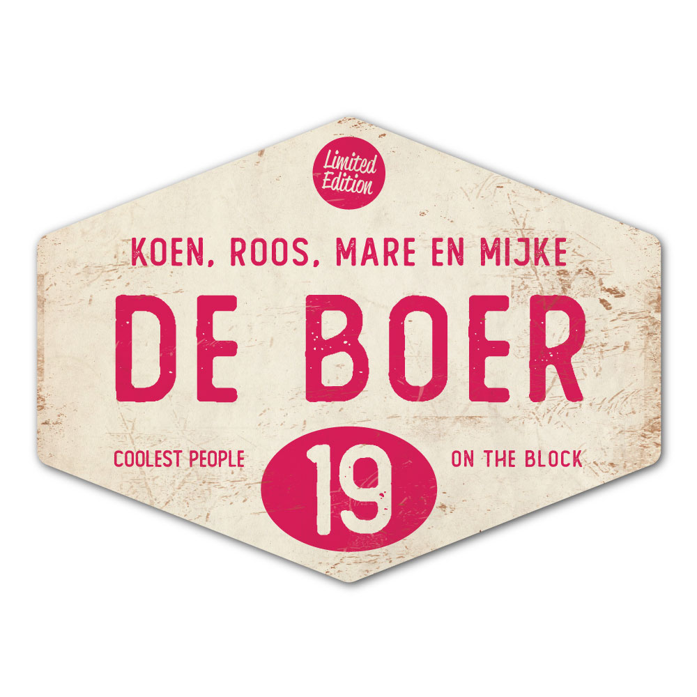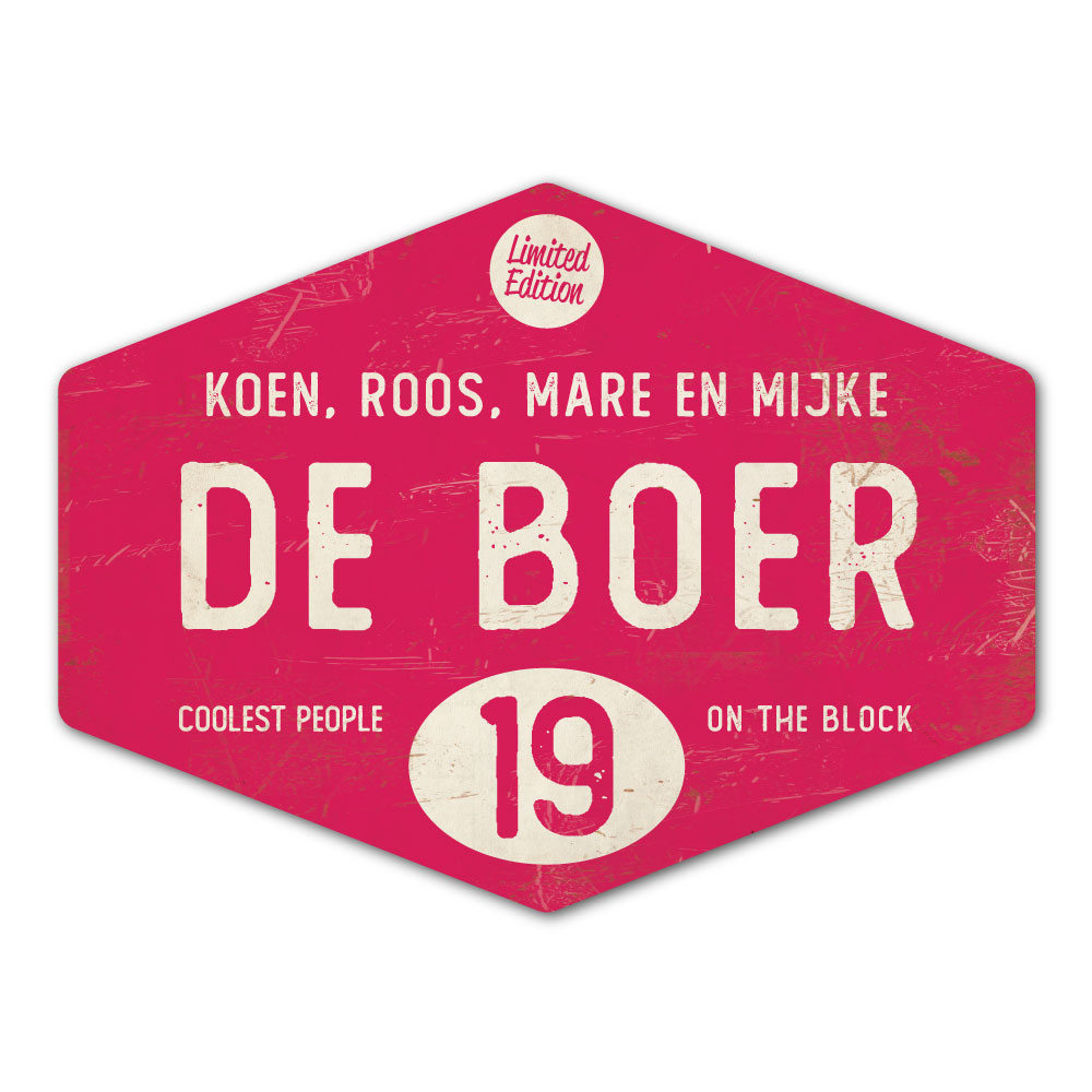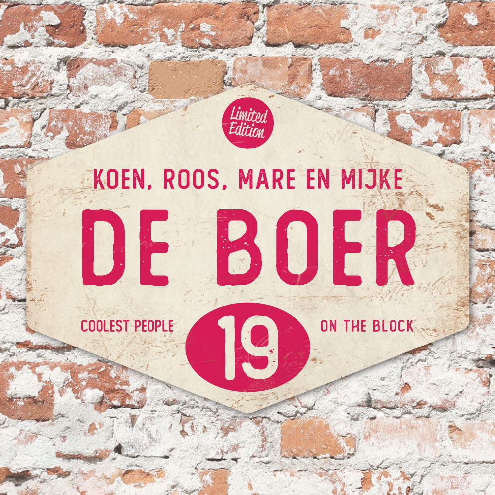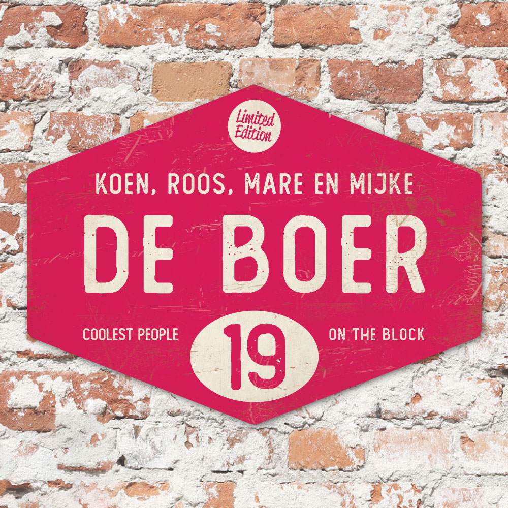 Mooi knalroze en zwart “vintage” naambordje in een ruitvorm met jouw achternaam, voornamen, huisnummer en leuke teksten. Stoer en origineel naambordje voor bij de voordeur van jouw huis. Maar natuurlijk ook leuk en origineel als cadeau voor iemand die net verhuisd is (housewarming).