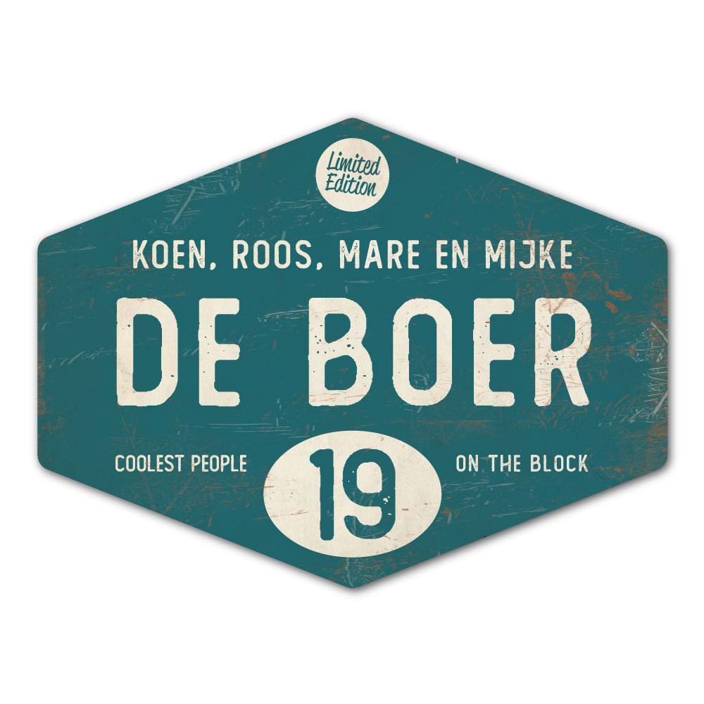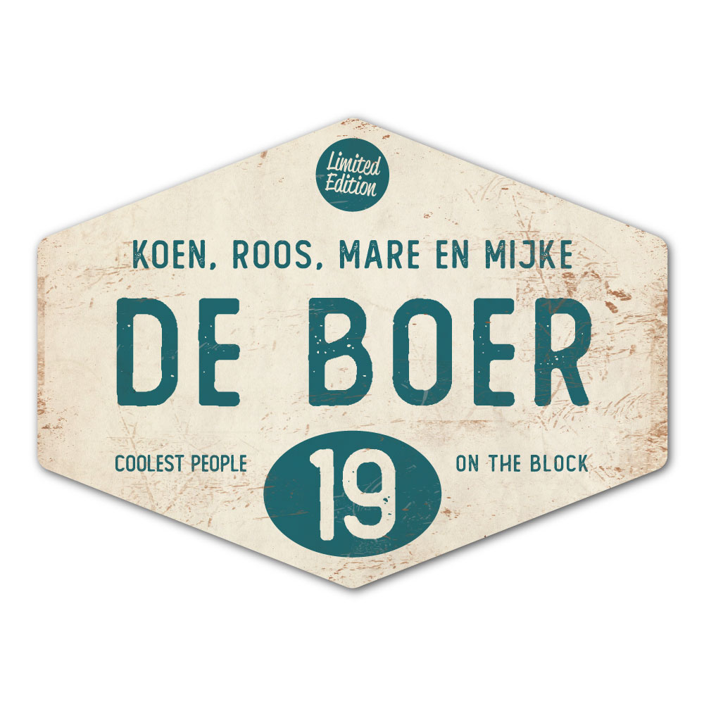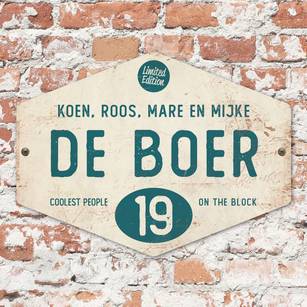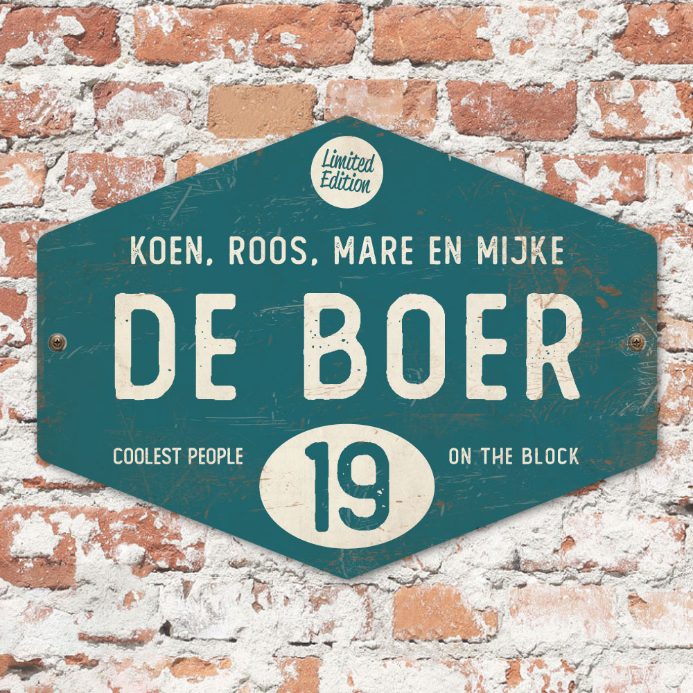 Mooi petrol blauw en wit “vintage” naambordje in een ruitvorm met jouw achternaam, voornamen, huisnummer en leuke teksten. Stoer en origineel naambordje voor bij de voordeur van jouw huis. Maar natuurlijk ook leuk en origineel als cadeau voor iemand die net verhuisd is (housewarming).