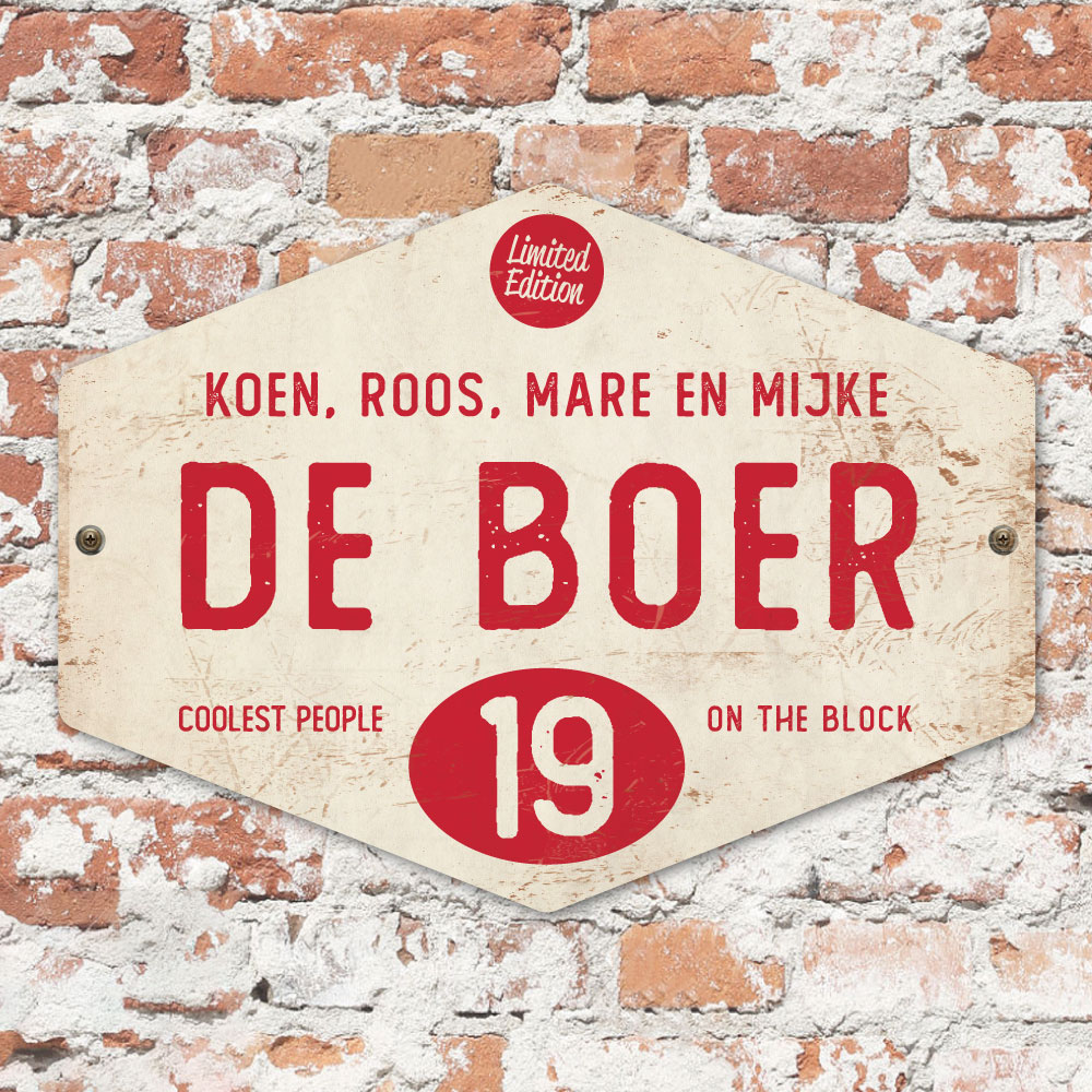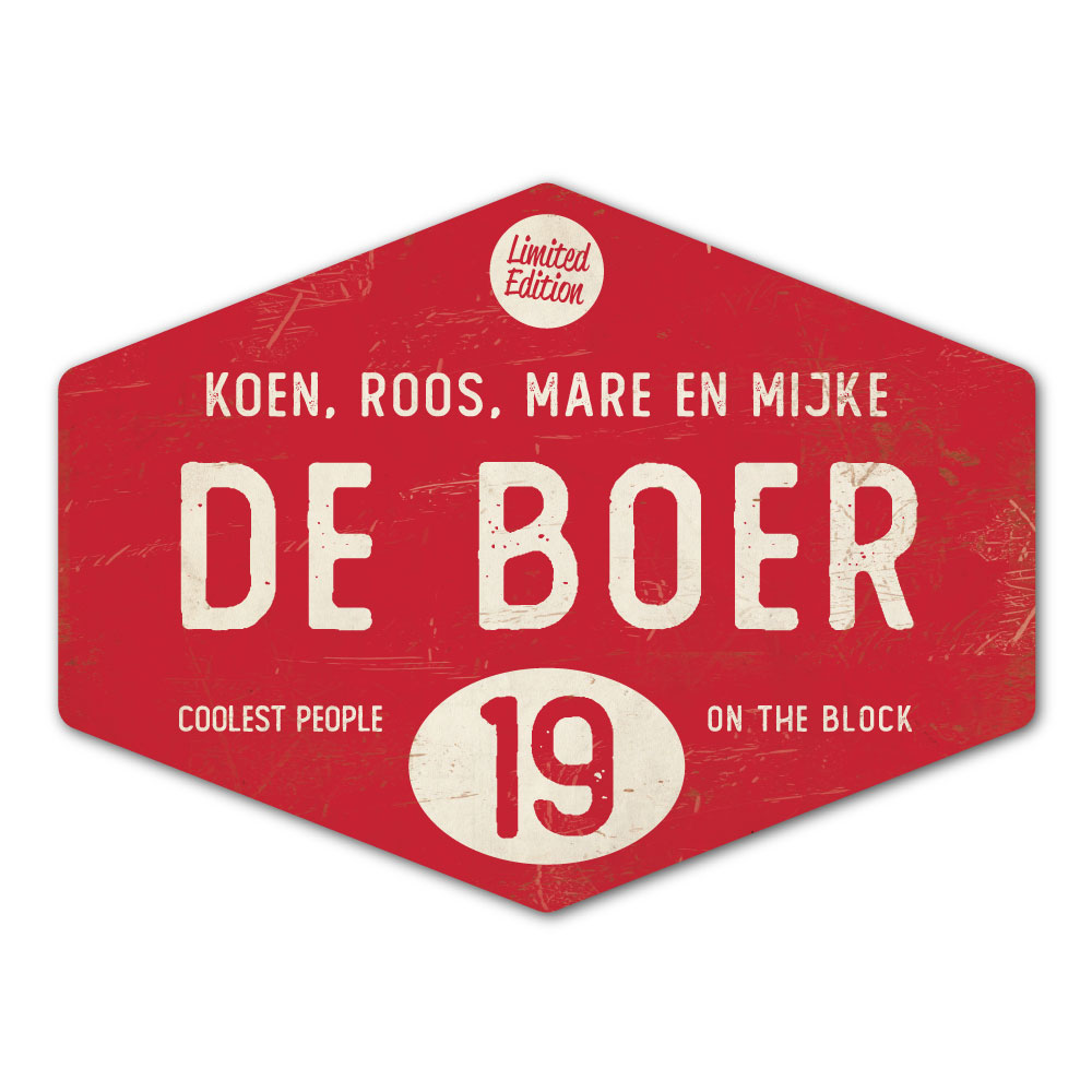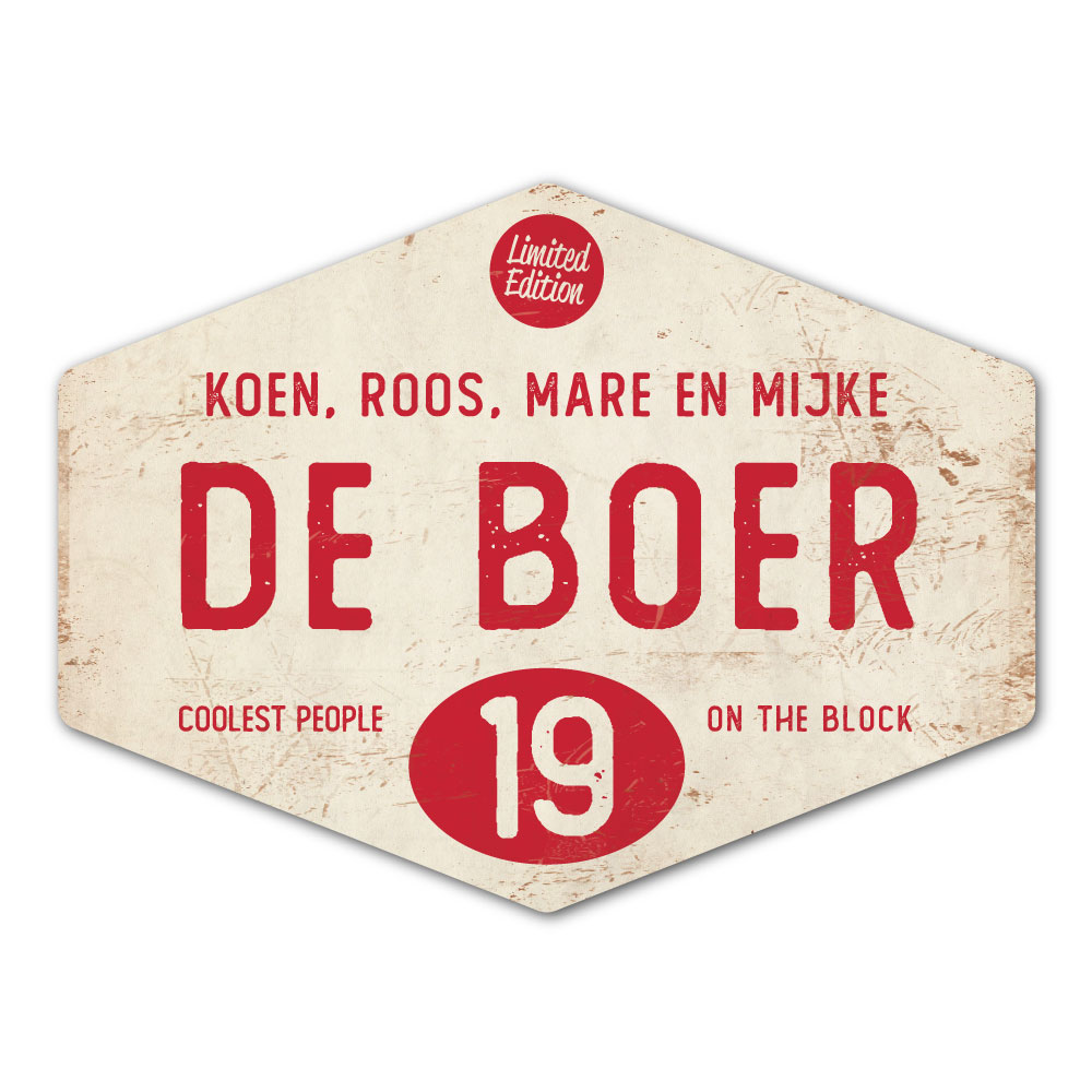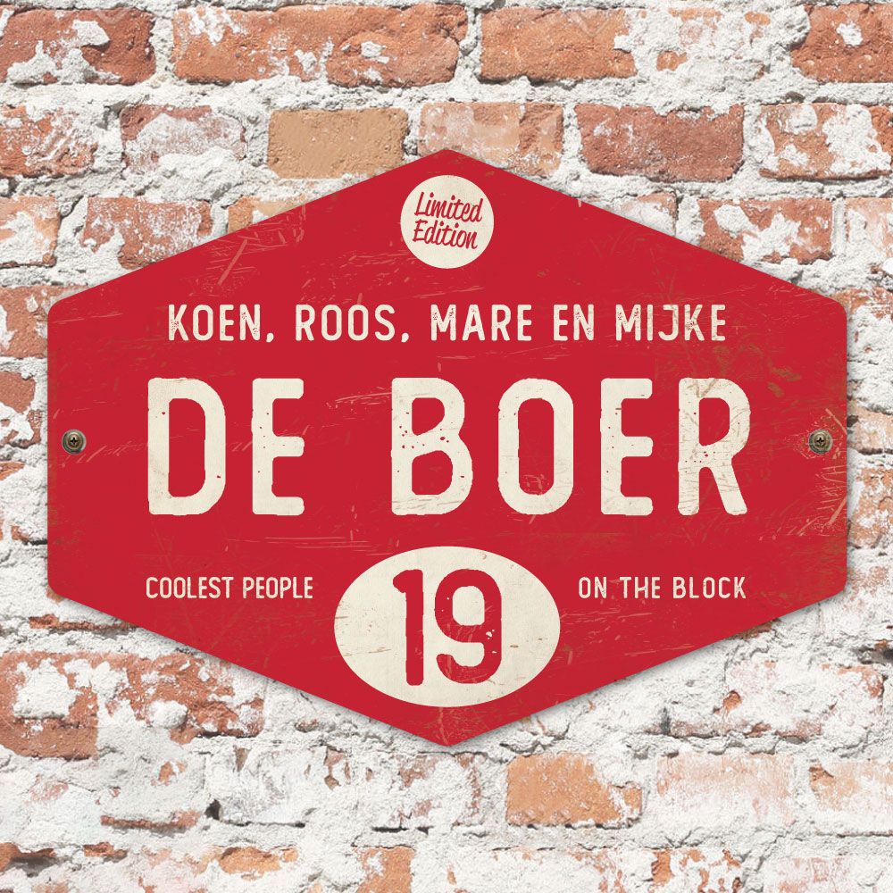 Mooi rood en wit “vintage” naambordje in een ruitvorm met jouw achternaam, voornamen, huisnummer en leuke teksten. Stoer en origineel naambordje voor bij de voordeur van jouw huis. Maar natuurlijk ook leuk en origineel als cadeau voor iemand die net verhuisd is (housewarming).