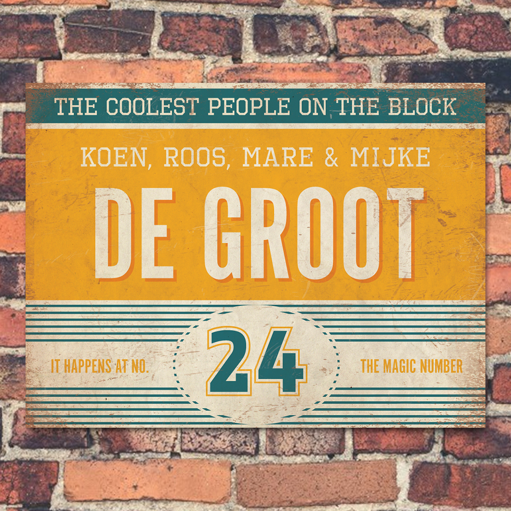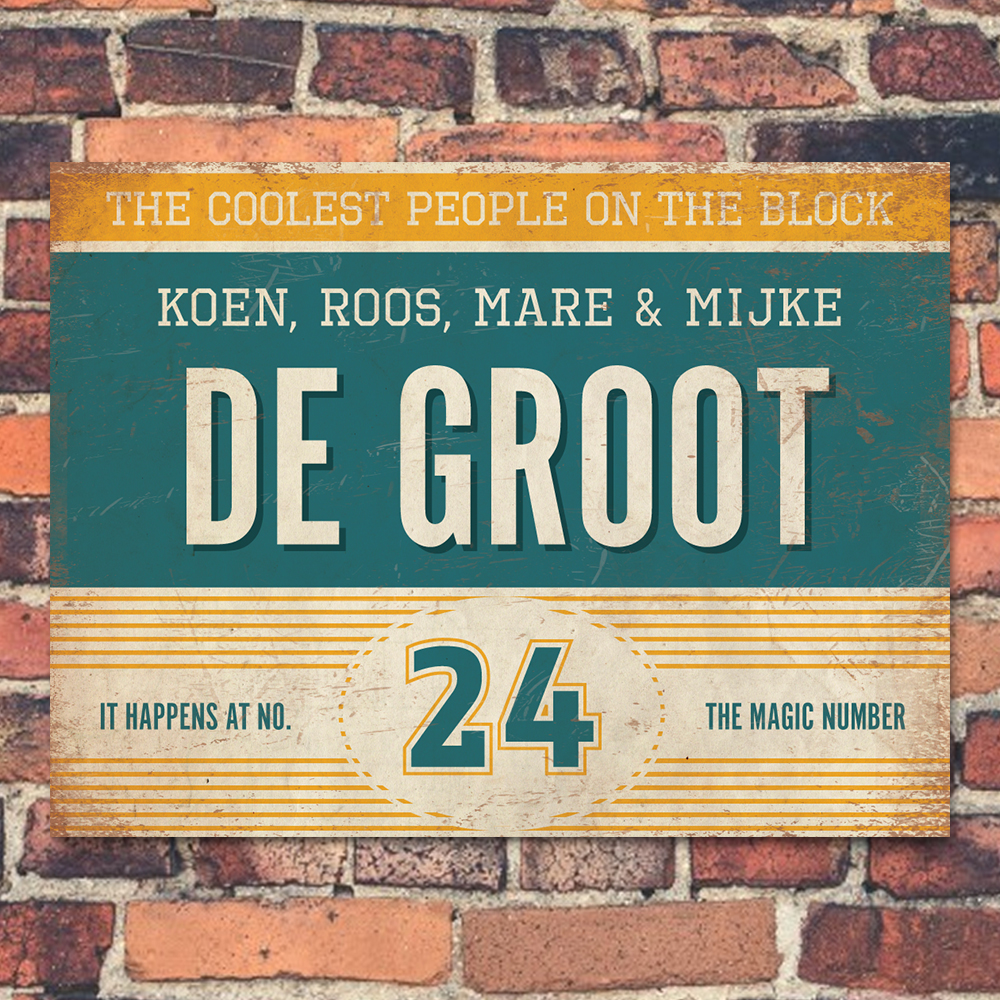 Mooi blauw, geel en wit “vintage” naambordje met jouw achternaam, voornamen, huisnummer en leuke teksten.Stoer en origineel naambordje voor bij de voordeur van jouw huis. Maar natuurlijk ook leuk en origineel als cadeau voor iemand die net verhuisd is (housewarming).