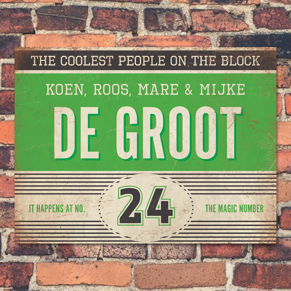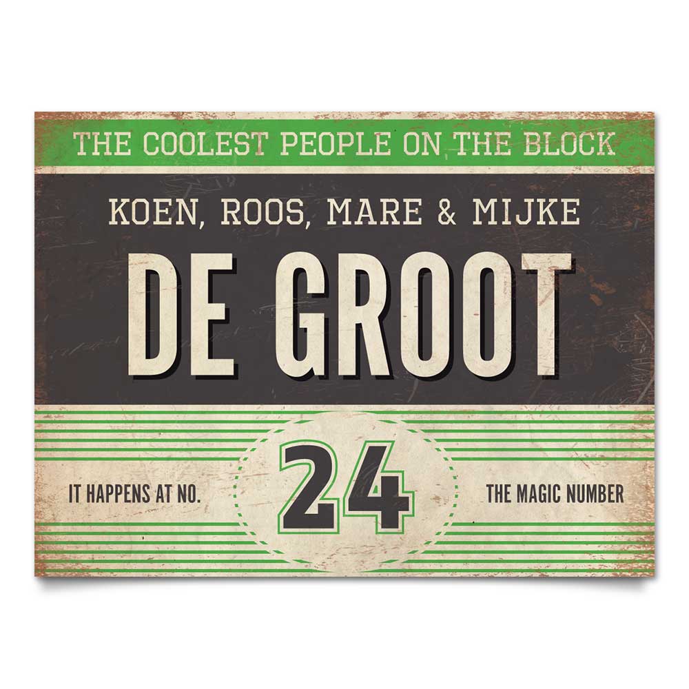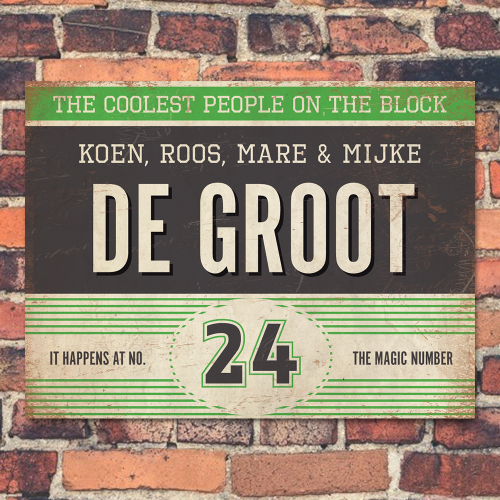 Mooi groen, zwart en wit “vintage” naambordje met jouw achternaam, voornamen, huisnummer en leuke teksten. Stoer en origineel naambordje voor bij de voordeur van jouw huis. Maar natuurlijk ook leuk en origineel als cadeau voor iemand die net verhuisd is (housewarming).