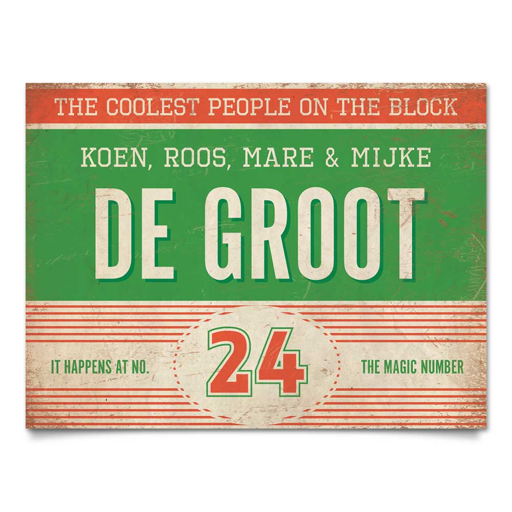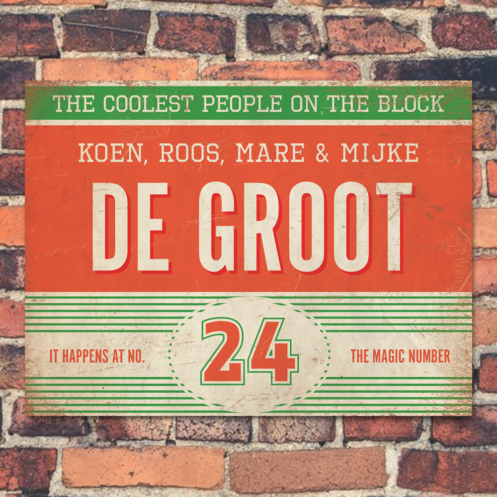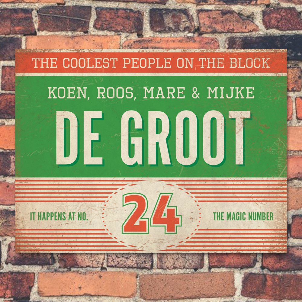 Mooi rood, groen en wit “vintage” naambordje met jouw achternaam, voornamen, huisnummer en leuke teksten. Stoer en origineel naambordje voor bij de voordeur van jouw huis. Maar natuurlijk ook leuk en origineel als cadeau voor iemand die net verhuisd is (housewarming).