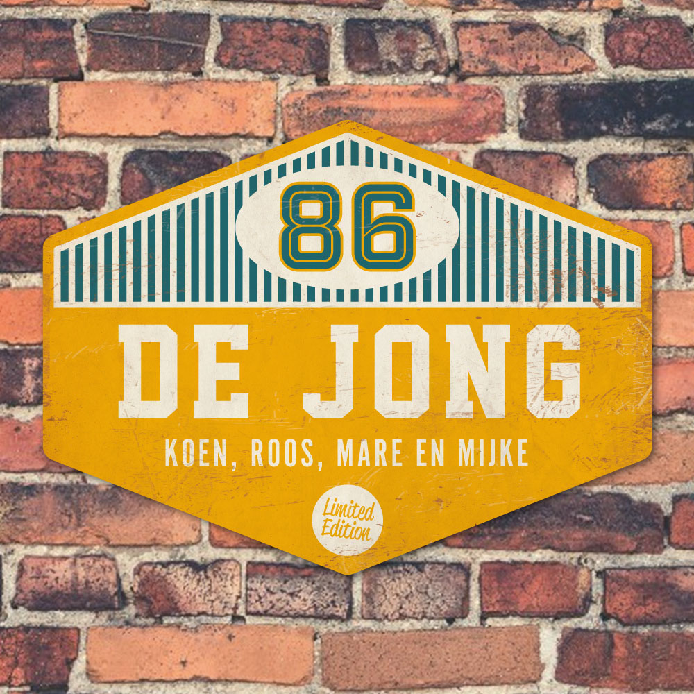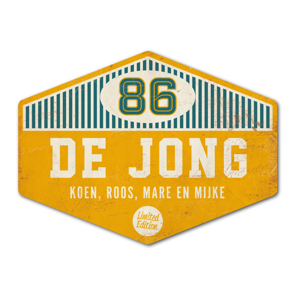 Mooi blauw, geel en wit “vintage” naambordje (Engelstalig reclamebord) in een mooie afwijkende vorm met jouw achternaam, voornamen, huisnummer en leuke teksten. Stoer en origineel naambordje voor bij de voordeur van jouw huis. Maar natuurlijk ook leuk en origineel als cadeau voor iemand die net verhuisd is (housewarming).