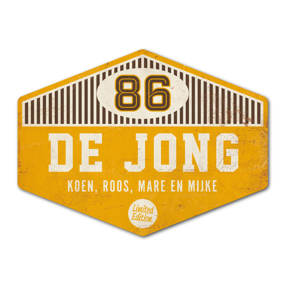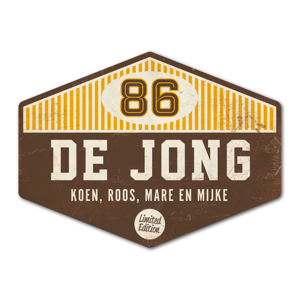 Mooi geel, bruin en wit “vintage” naambordje (Engelstalig reclamebord) in een mooie afwijkende vorm met jouw achternaam, voornamen, huisnummer en leuke teksten. Stoer en origineel naambordje voor bij de voordeur van jouw huis. Maar natuurlijk ook leuk en origineel als cadeau voor iemand die net verhuisd is (housewarming).