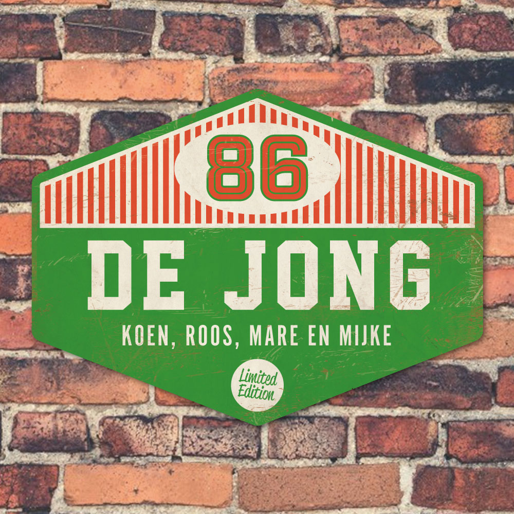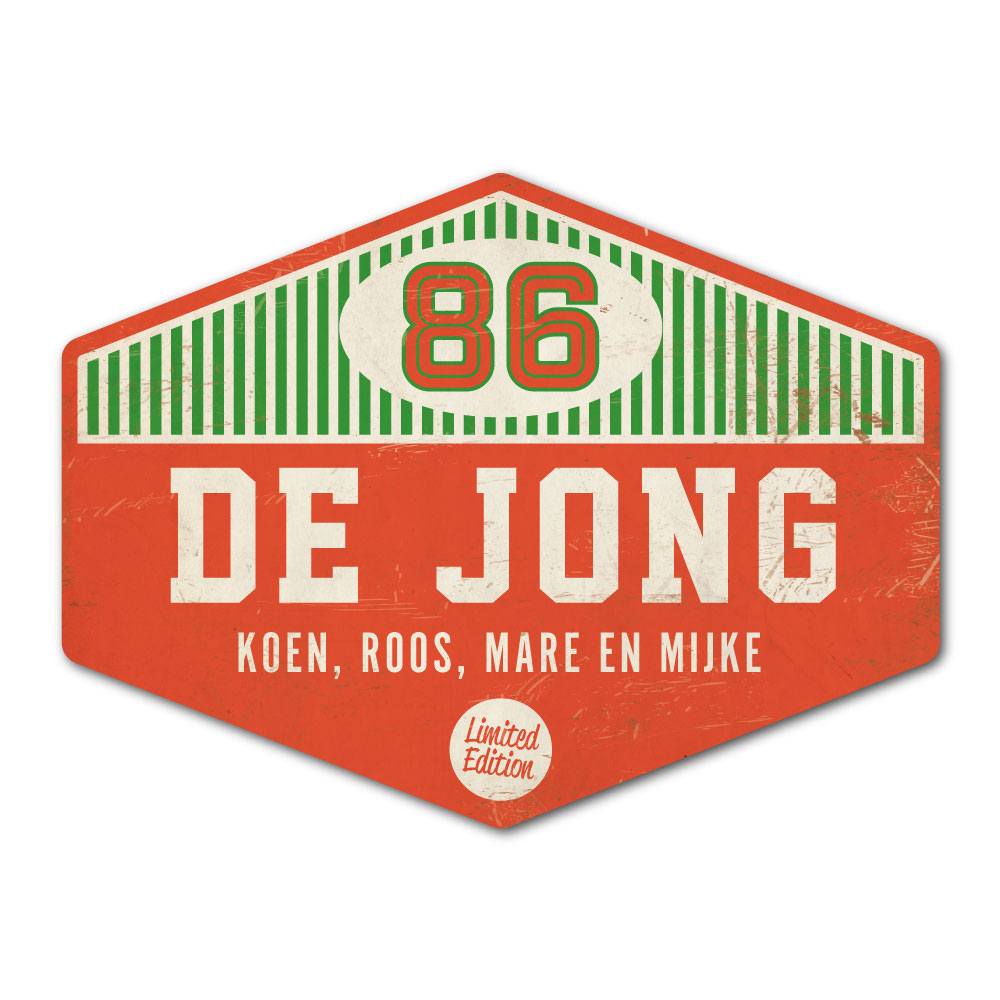 Mooi groen, rood en wit “vintage” naambordje (Engelstalig reclamebord) in een mooie afwijkende vorm met jouw achternaam, voornamen, huisnummer en leuke teksten. Stoer en origineel naambordje voor bij de voordeur van jouw huis. Maar natuurlijk ook leuk en origineel als cadeau voor iemand die net verhuisd is (housewarming).