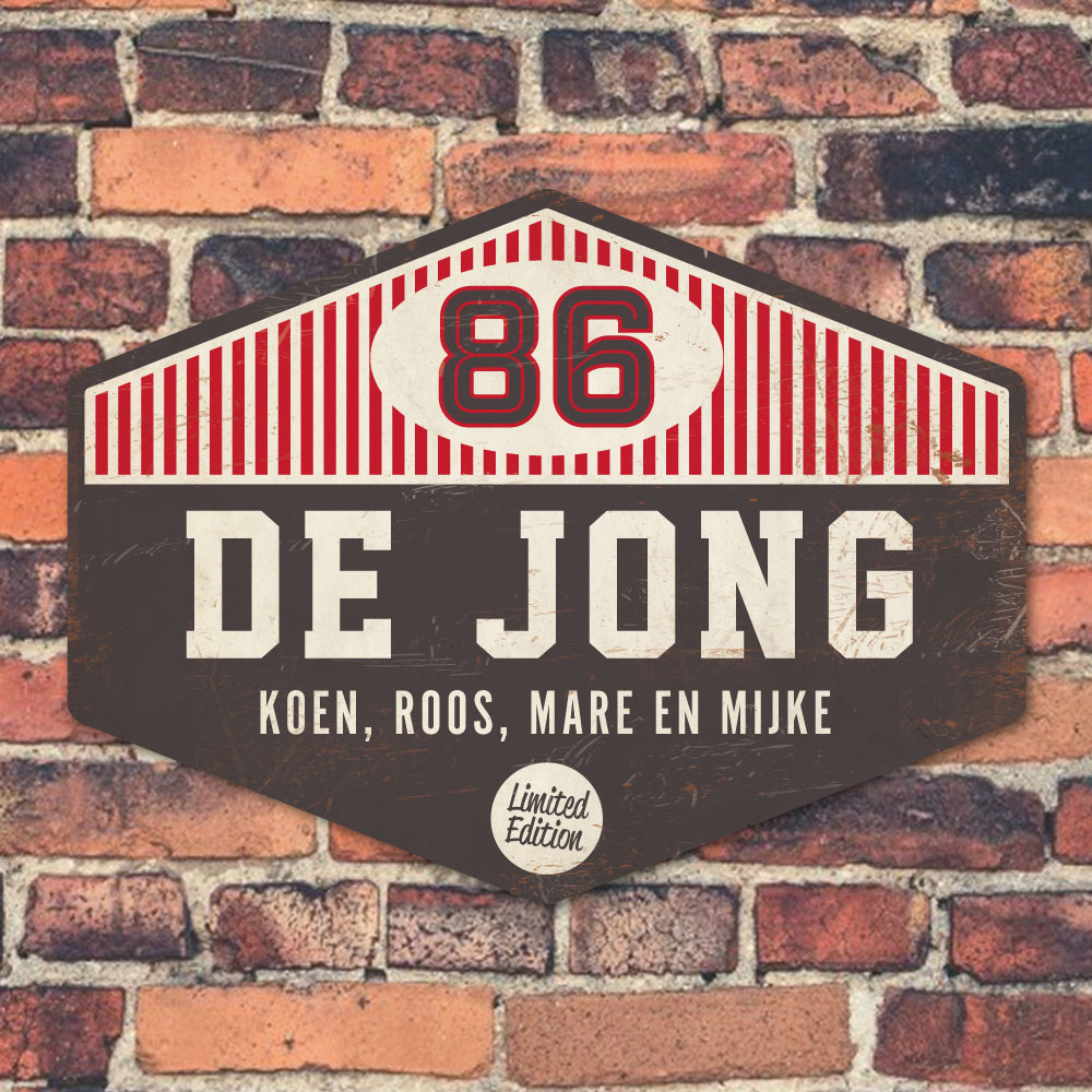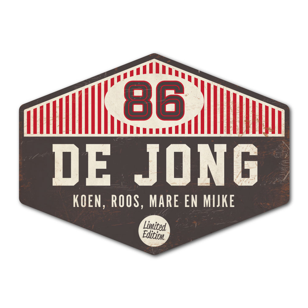 Mooi zwart, rood en wit “vintage” naambordje (Engelstalig reclamebord) in een mooie afwijkende vorm met jouw achternaam, voornamen, huisnummer en leuke teksten. Stoer en origineel naambordje voor bij de voordeur van jouw huis. Maar natuurlijk ook leuk en origineel als cadeau voor iemand die net verhuisd is (housewarming).