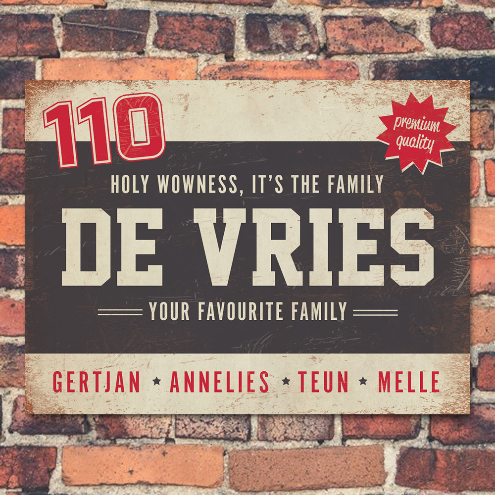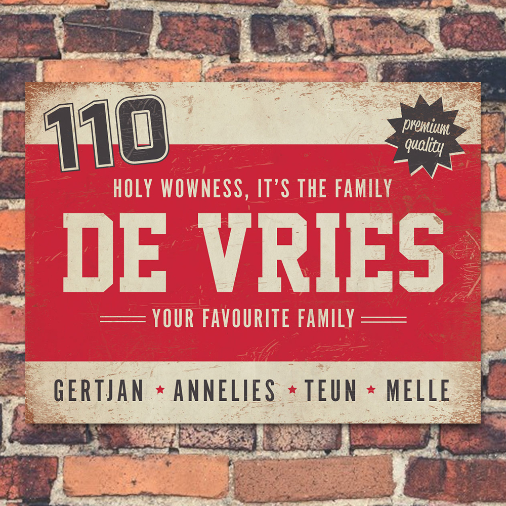 Mooi rood, zwart en wit “vintage” naambordje (Engelstalig reclamebord) met jouw achternaam, voornamen, huisnummer en leuke teksten. Stoer en origineel naambordje voor bij de voordeur van jouw huis. Maar natuurlijk ook leuk en origineel als cadeau voor iemand die net verhuisd is (housewarming).