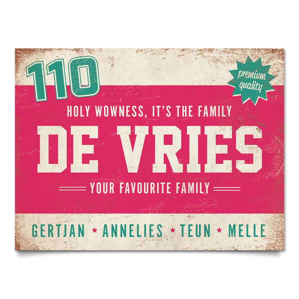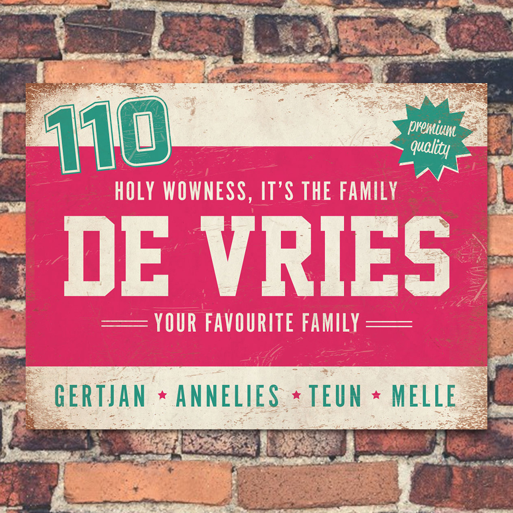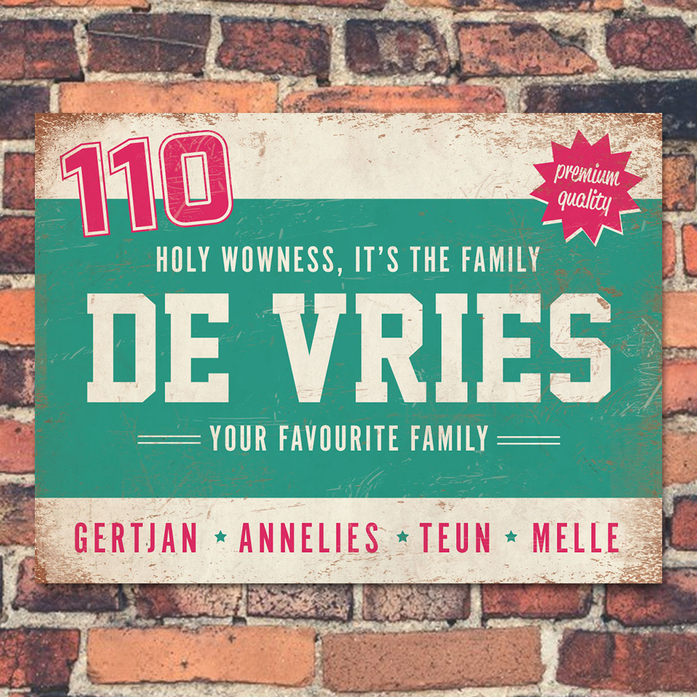 Mooi roze, mint en wit “vintage” naambordje (Engelstalig reclamebord) met jouw achternaam, voornamen, huisnummer en leuke teksten. Stoer en origineel naambordje voor bij de voordeur van jouw huis. Maar natuurlijk ook leuk en origineel als cadeau voor iemand die net verhuisd is (housewarming).