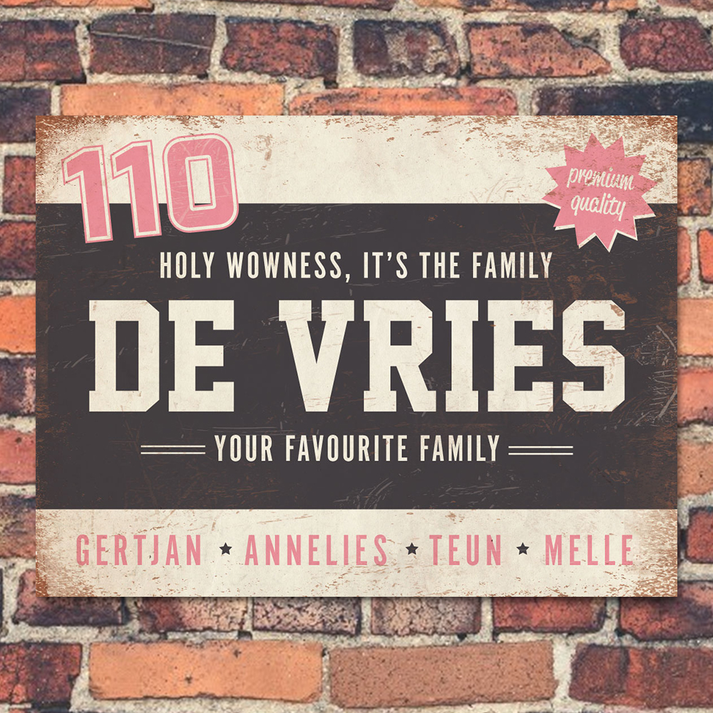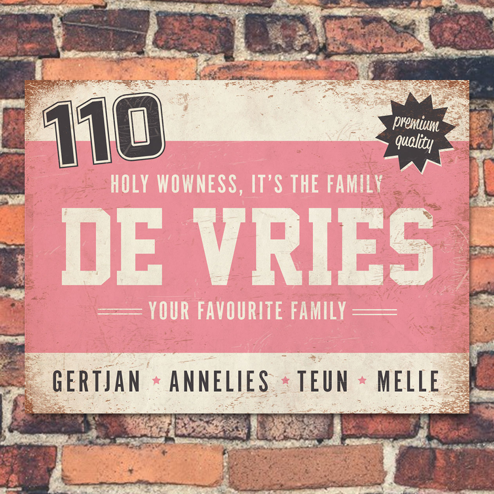 Mooi roze, zwart en wit “vintage” naambordje (Engelstalig reclamebord) met jouw achternaam, voornamen, huisnummer en leuke teksten. Stoer en origineel naambordje voor bij de voordeur van jouw huis. Maar natuurlijk ook leuk en origineel als cadeau voor iemand die net verhuisd is (housewarming).
