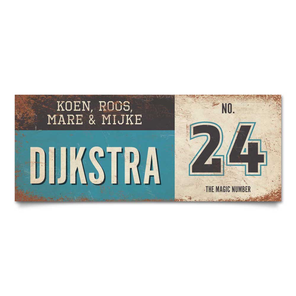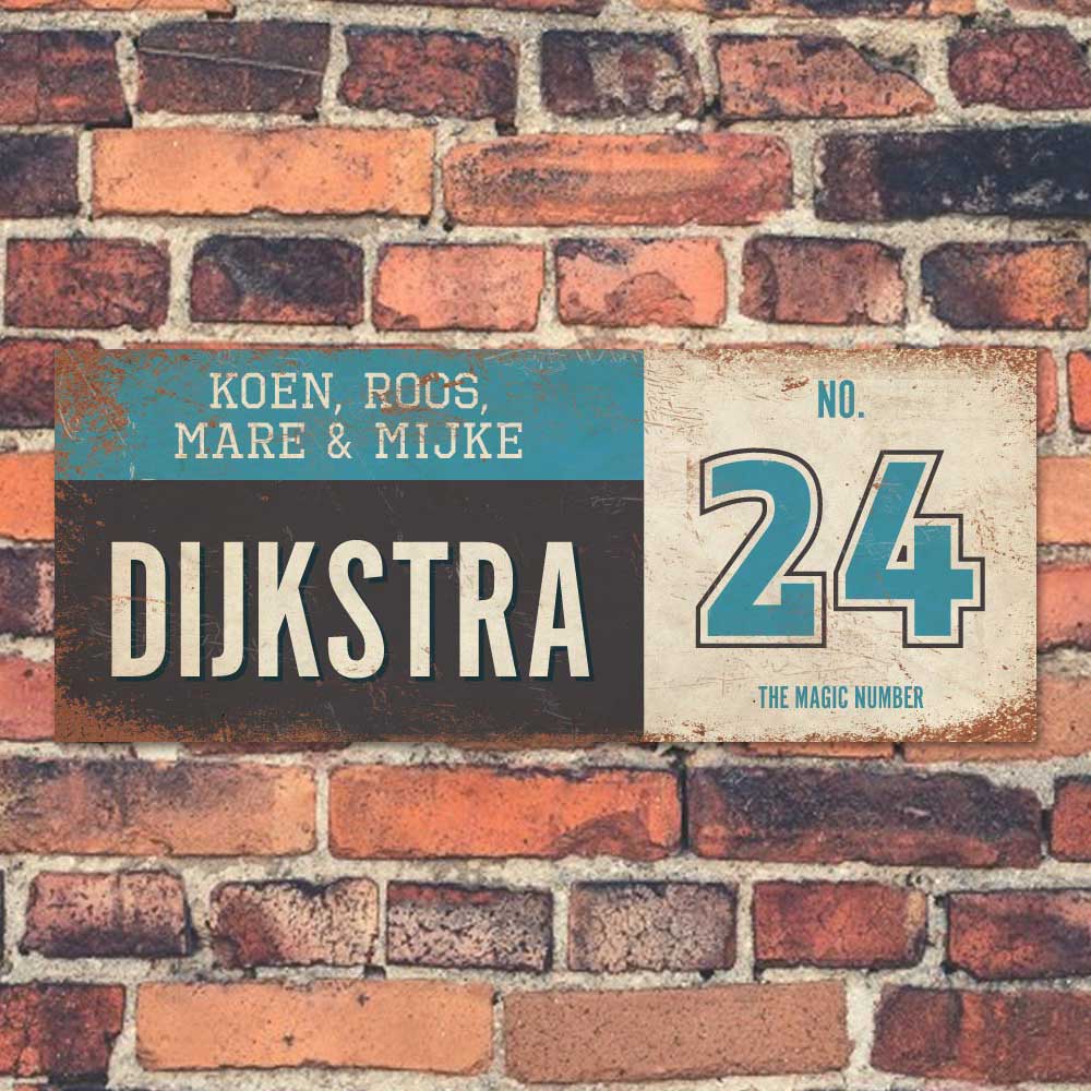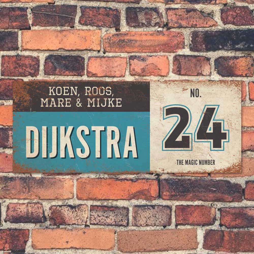 Mooi blauw, zwart en wit “vintage” langwerpig naambordje met uw achternaam, voornamen en huisnummer. Stoer en origineel naambordje voor bij de voordeur van jouw huis. Maar natuurlijk ook leuk en origineel als cadeau voor iemand die net verhuisd is (housewarming).