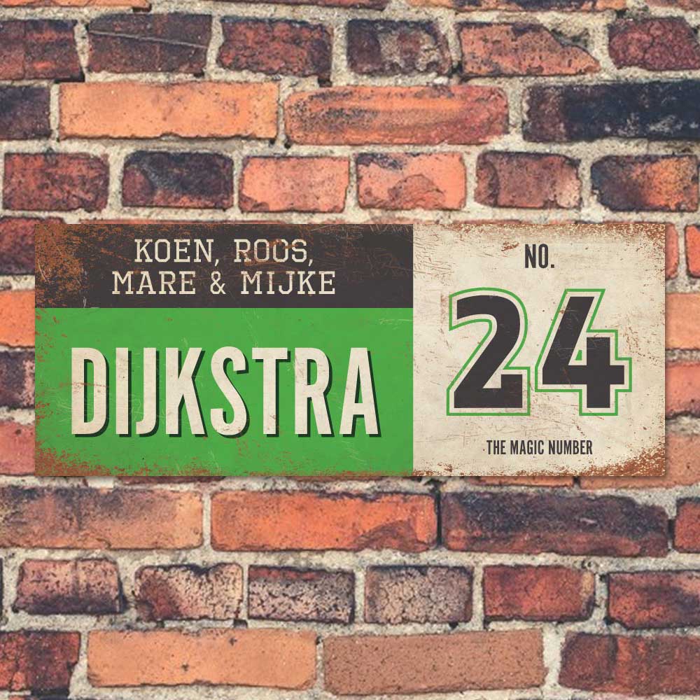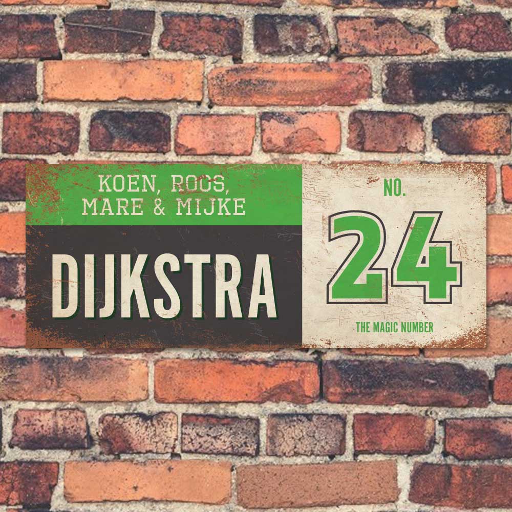 Mooi groen, zwart en wit “vintage” langwerpig naambordje met uw achternaam, voornamen en huisnummer. Stoer en origineel naambordje voor bij de voordeur van jouw huis. Maar natuurlijk ook leuk en origineel als cadeau voor iemand die net verhuisd is (housewarming).